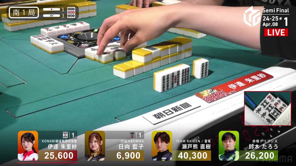 Immediately after, Honda finally gets to tenpai and calls riichi on a 25s ryanmen. Only the red 5s remains in the wall.
