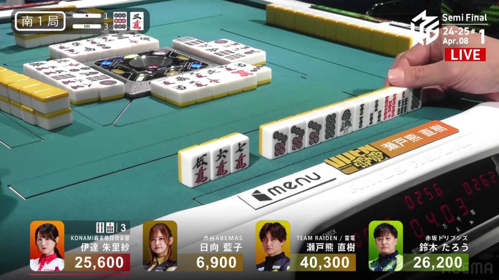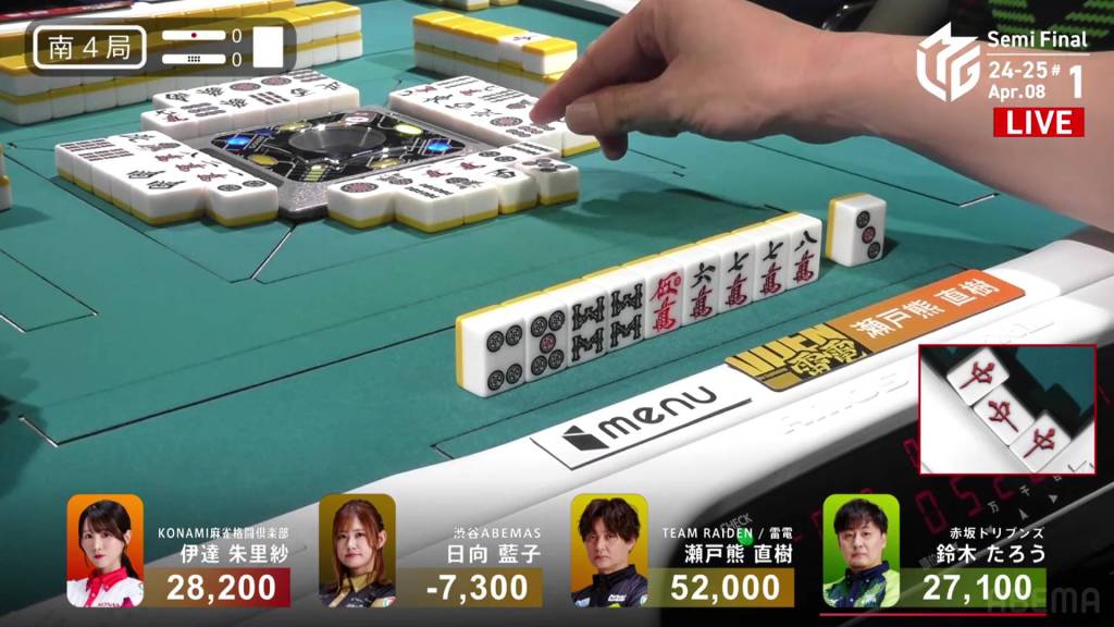 At the end of the second row, Setokuma gets to tenpai and calls riichi on a 6s kanchan.