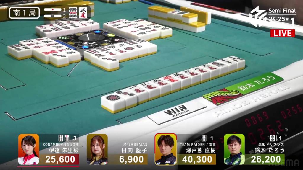 In S1-3, Taro is in 3rd place and 14,100 beind 1st place Setokuma. 1,300 in bonus sticks are in the pot.
