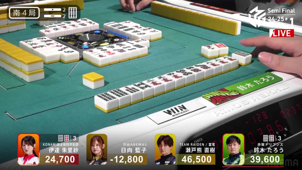 At the end of the second row, Taro draws the 9s and wins the hand. Taro wins with Riichi/Tsumo/Dora 2 for 4,000+200 all plus three riichi sticks, moving up to 1st place.