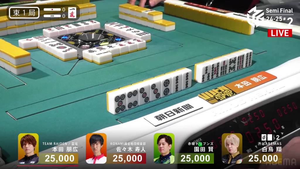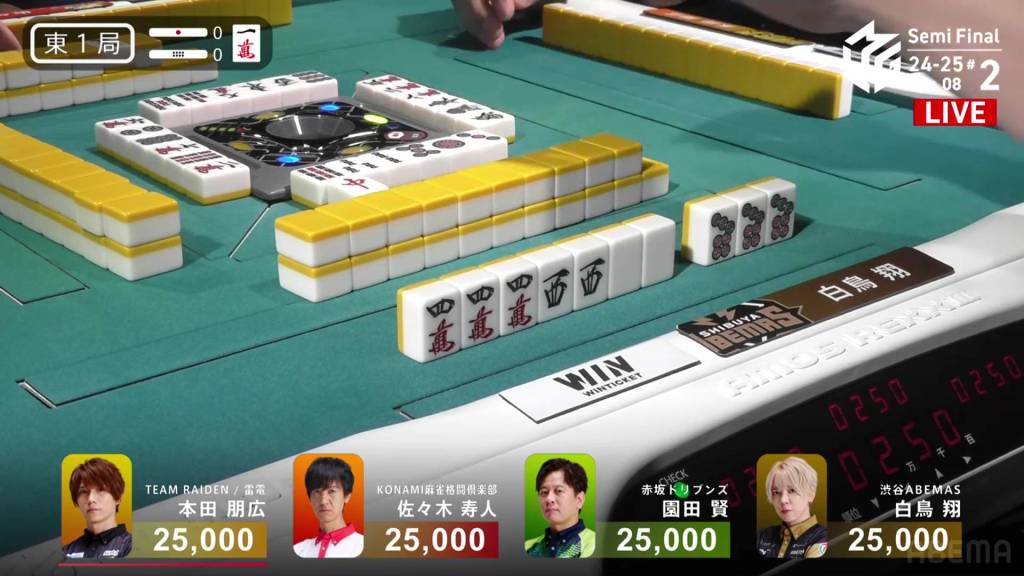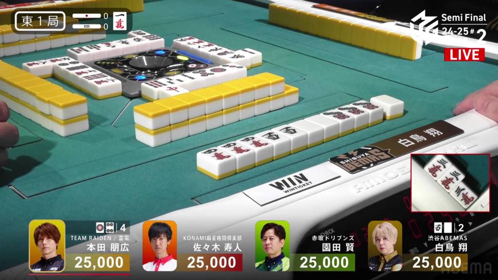Within the first go-around, Shiratori draws the white dragon and wins the hand. Shiratori wins with Toitoi/Sanankou/White Dragon for 2,000/4,000 plus a riichi stick, taking the early lead.