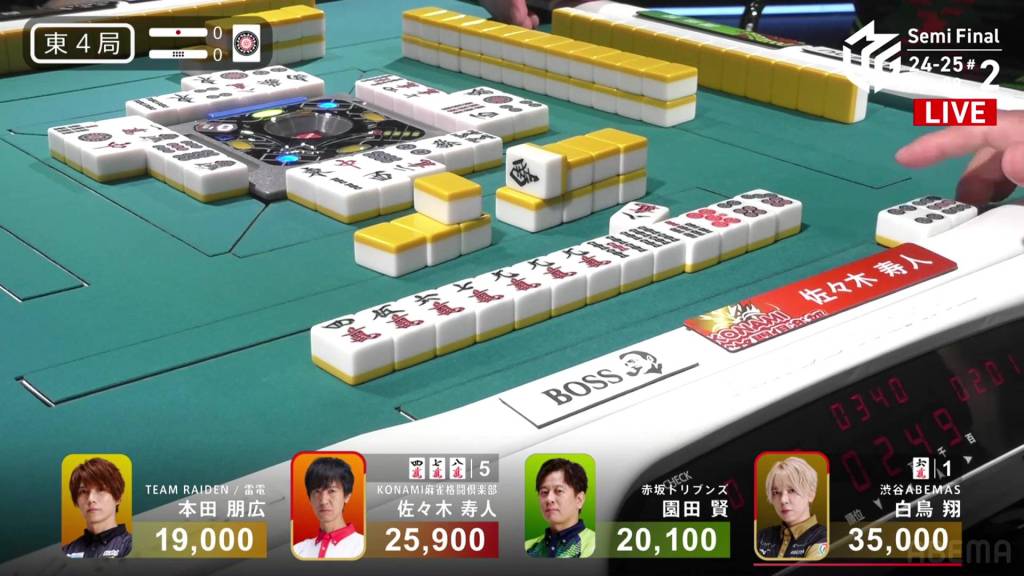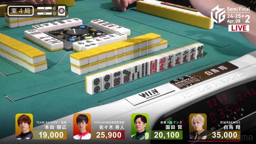 On Honda’s final draw, Honda gets the red 5s and wins the hand. Honda wins with Riichi/Tsumo/White Dragon/Aka 1 for 2,000/4,000 plus a riichi stick, moving up to 1st place going into the final hand.
