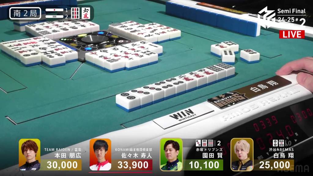 As the turns go on, Honda’s two winning tiles go down to one, then down to zero near the end of the second row. However, there is still a chance for someone to discard it. In the middle of the third row, Sonoda gets himself to yakuless tenpai on a 2s kanchan. On the second-last tile in the wall, Sonoda draws a 3s, now having a choice between a 2s kanchan (throwing the 3s) or a 3s/2p shanpon (throwing the 1s). With the 1s being further away from the dora, Sonoda discards the 1s trying to maintain tenpai and deals into Honda. Honda wins the hand with Riichi/Pinfu/Dora 3 for 12,000, moving up to 2nd.