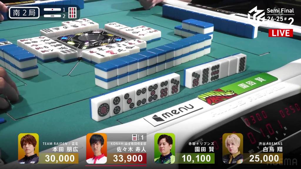 Moving to S4-2, Taro is now 6,900 behind 1st place Setokuma. Two riichi sticks and two honba are in the pot.