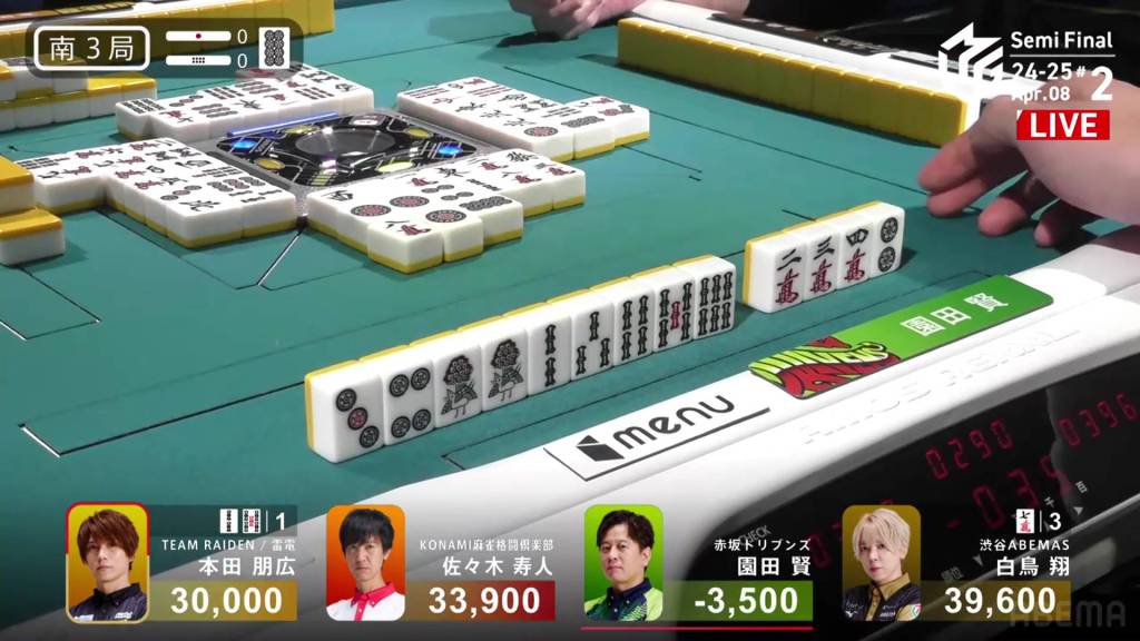 Within the go-around, Sonoda gets to a wide iishanten and waits on a 369p wait. If the 6p is discarded, Hisato gets priority.