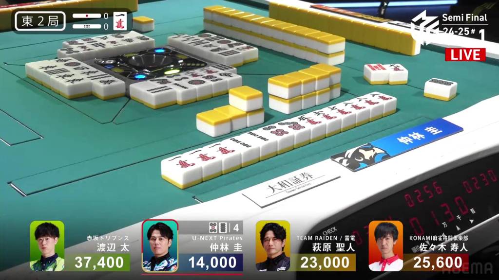 In E2-0, Nakabayashi is the dealer in 4th place, 9,000 behind 3rd place Hagiwara and 11,600 behind 2nd place Hisato.