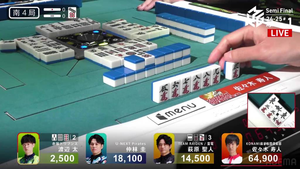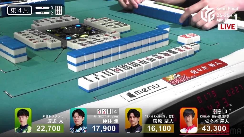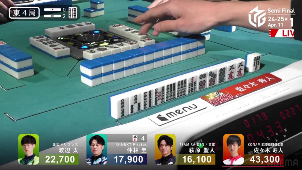 On Setokuma’s very next draw, he gets the 5p and wins the hand. Setokuma wins with Riichi/Tsumo/Sanshoku for 2,000+100/4,000+100 plus a two riichi sticks, cutting the deficit down to 2,700 going into his final dealership.