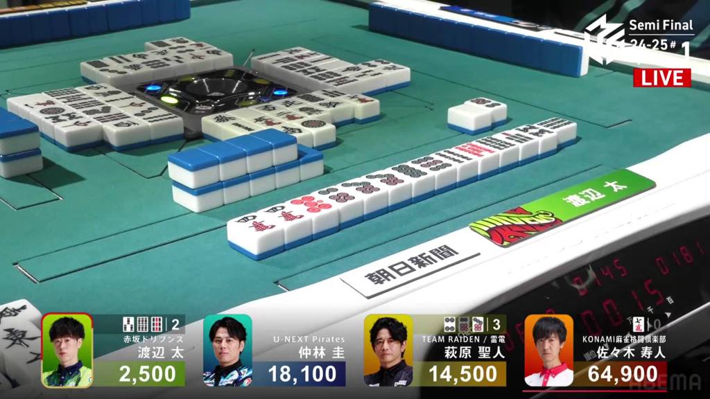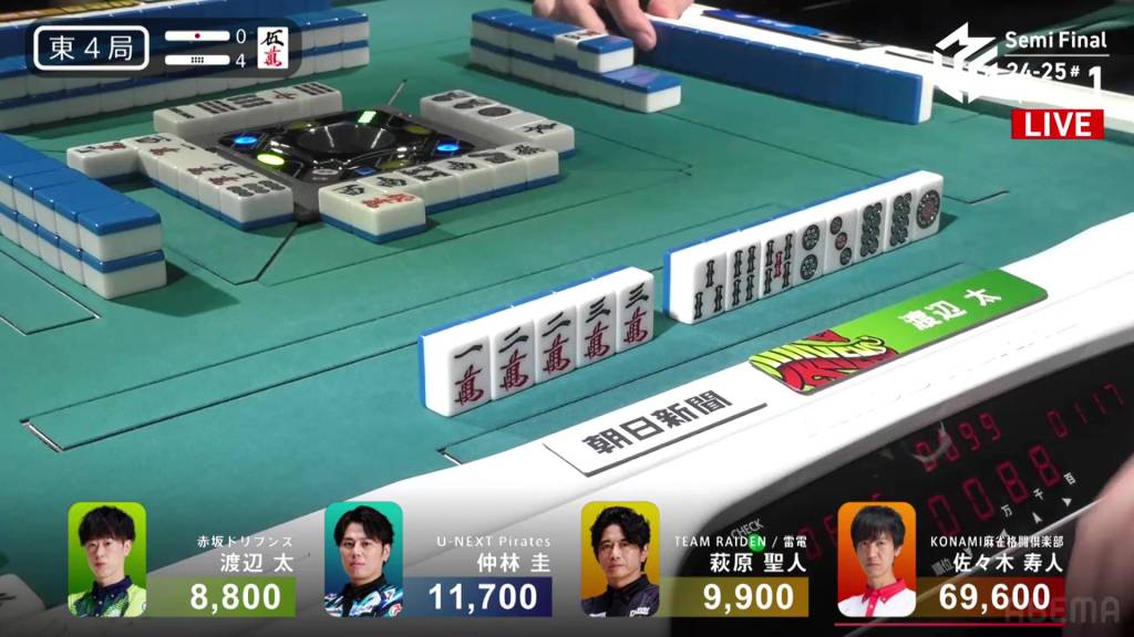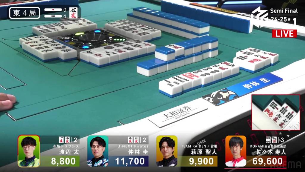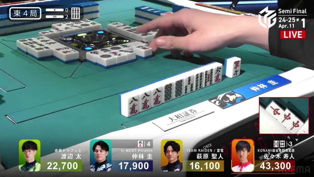 Across from him, Nakabayashi has been tenpai for a few turns, waiting on a 5m kanchan. In the middle of the second row, he improves to a 58m/8p wait.