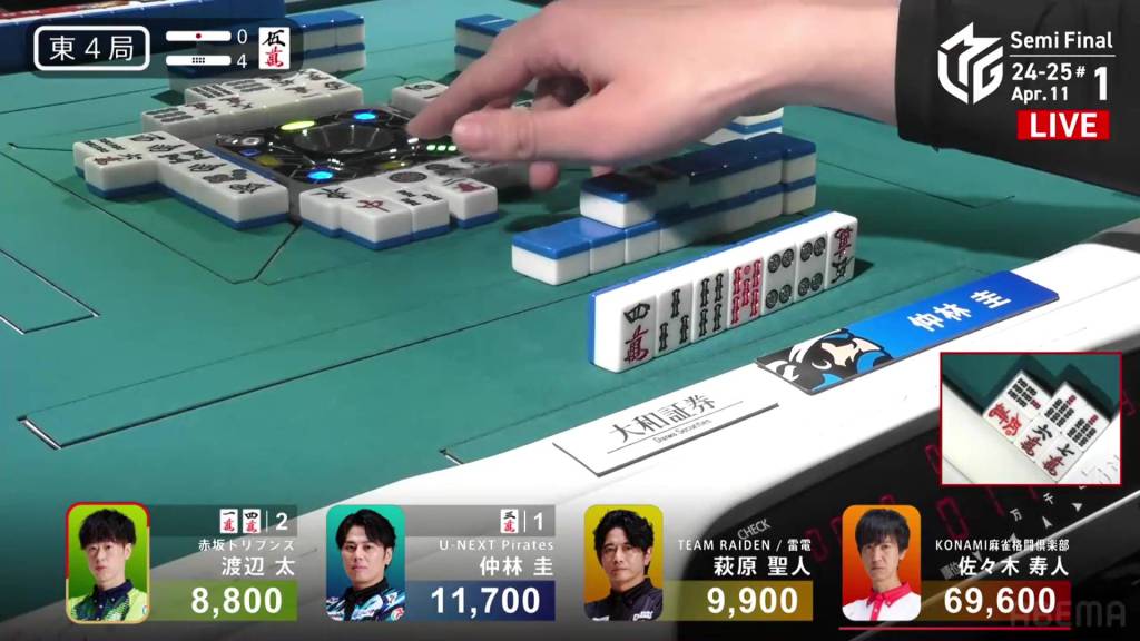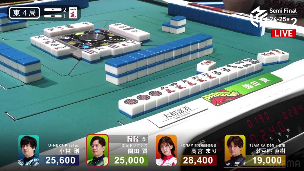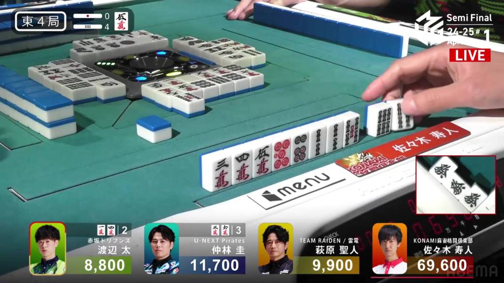 In E4-1, Sonoda is in 2nd place and 3,400 behind 1st place Takamiya. With two riichi sticks and a honba, any hand other than the cheapest will be enough for 1st place.