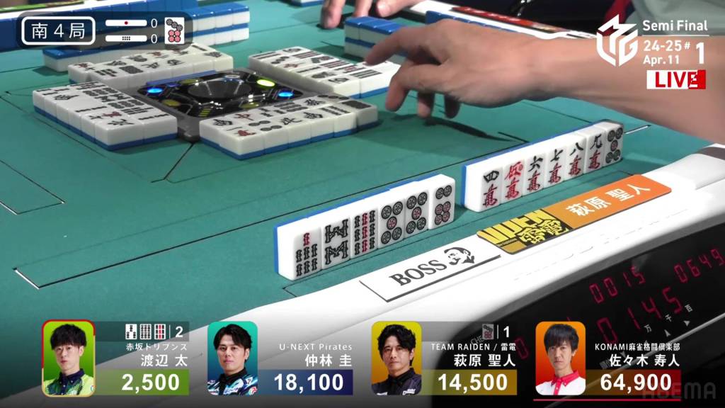 In S4-0, Futoshi is in 4th place, 12,000 behind 3rd place Hagiwara. To escape 4th place, Futoshi needs a 3/50 or 4/25 direct hit, a haneman tsumo or a haneman ron (for a tie). If Futoshi wants 2nd place, he needs a baiman.