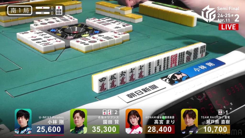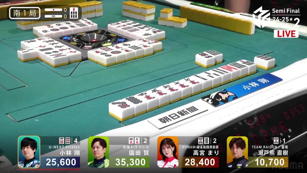 In S1-0, Kobayashi is the dealer in 3rd place, 2,800 behind 2nd place Takamiya and 9,700 behind 1st place Sonoda.