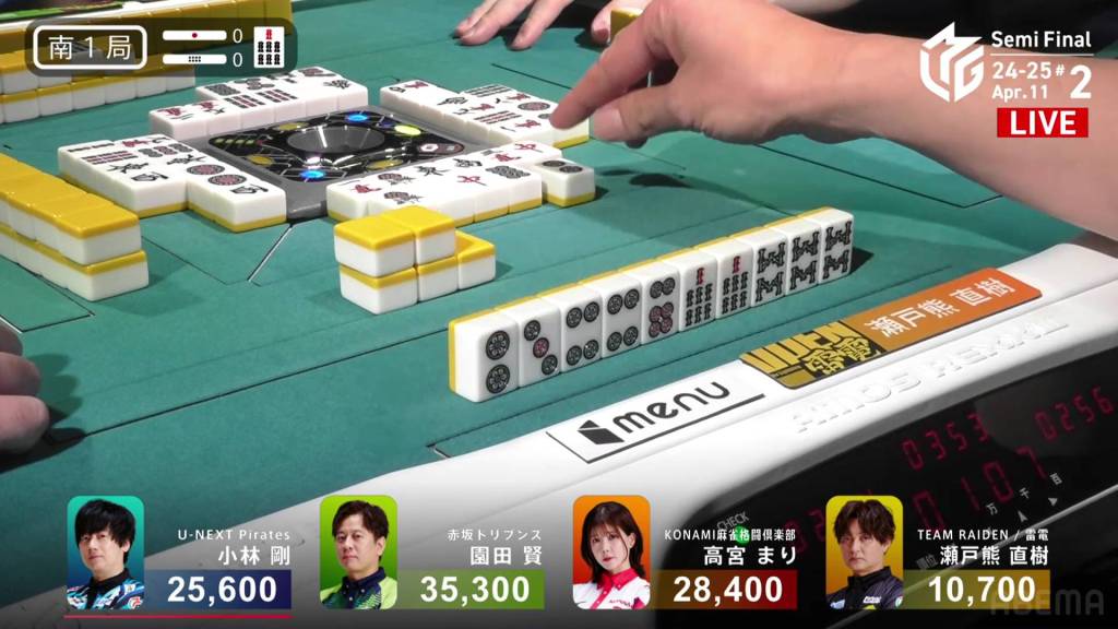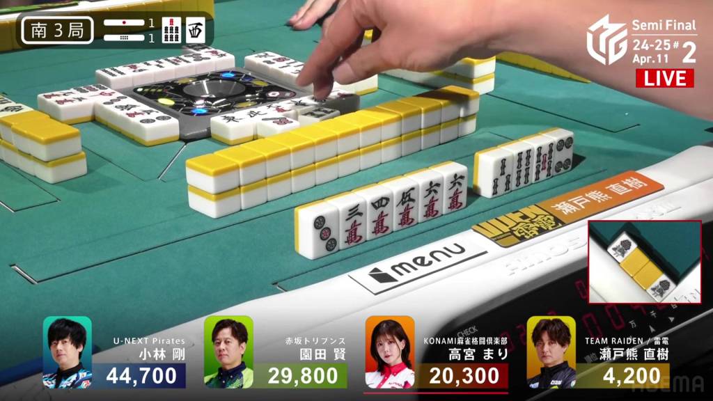 Sitting between them is dealer Hisato, who has already called pon on the 3m and east, going for honitsu. In the middle of the third row, Hisato gets to tenpai on a 7m wait.