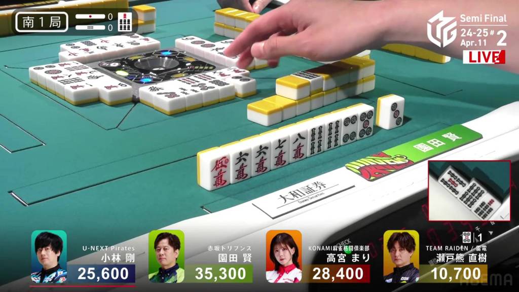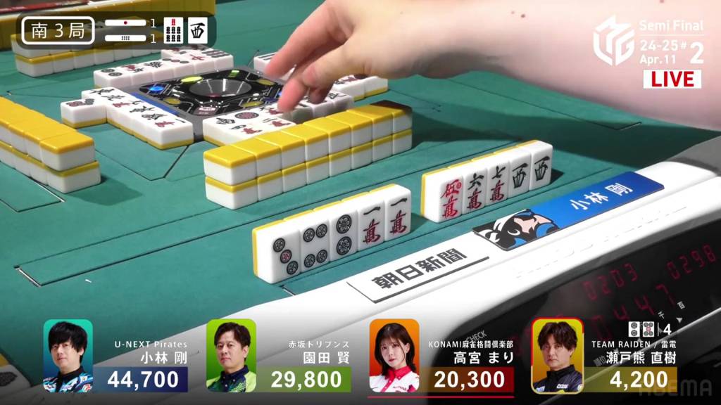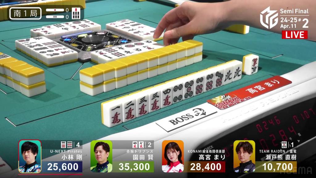 With Sonoda’s first draw, he creates a 345p sequence to join his 6m triplet and 1p triplet, getting to iishanten. On his very next turn, he completes a west pair and calls riichi on a 25m ryanmen. With not much information to go on, Setokuma decides to push. At the end of the first row, Setokuma discards the 2m trying to maintain iishanten and deals into Sonoda. With the uradora flip, Sonoda’s 6m suddenly becomes the new dora and upgrades him to mangan. Sonoda wins with Riichi/Ura 3 for 8,000+300 plus two riichi sticks, moving up to 1st place with his second Ura 3 in his M-League career.