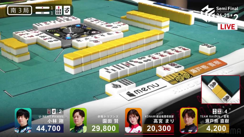 In S3-1, Setokuma is behind, sitting 16,100 behind 3rd place dealer Takamiya. He wants to make up as much ground as he can before his final dealership. A riichi stick and a honba sit in the pot.