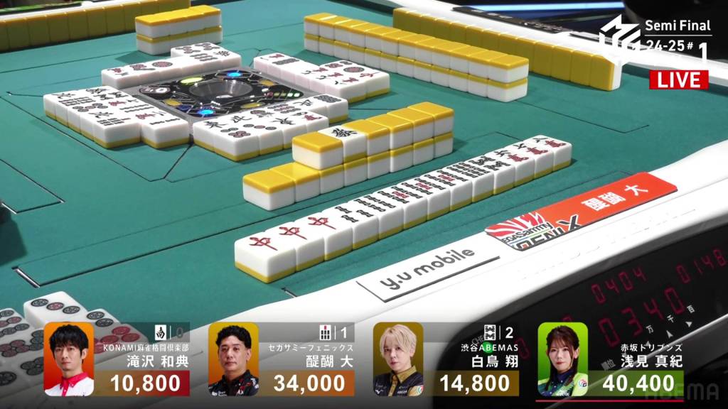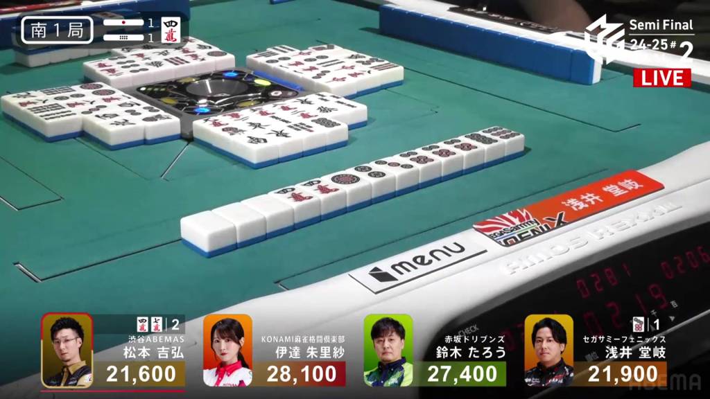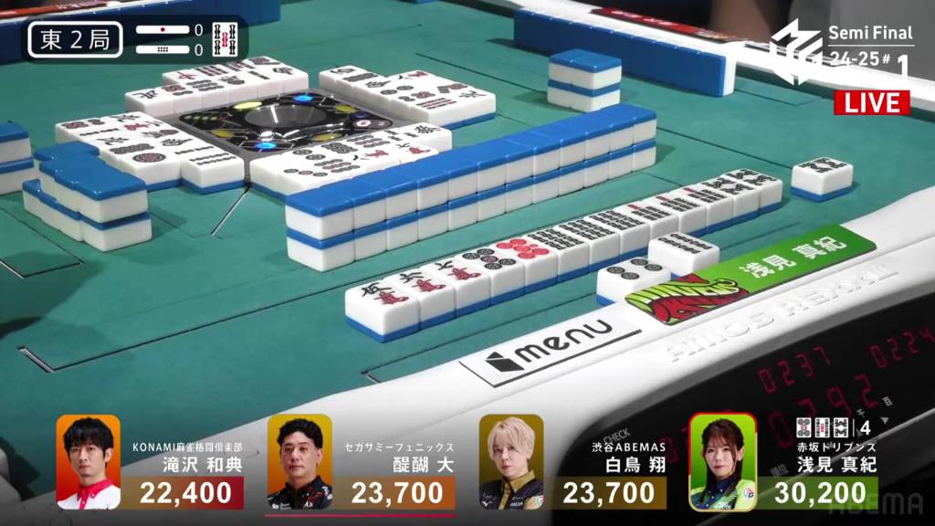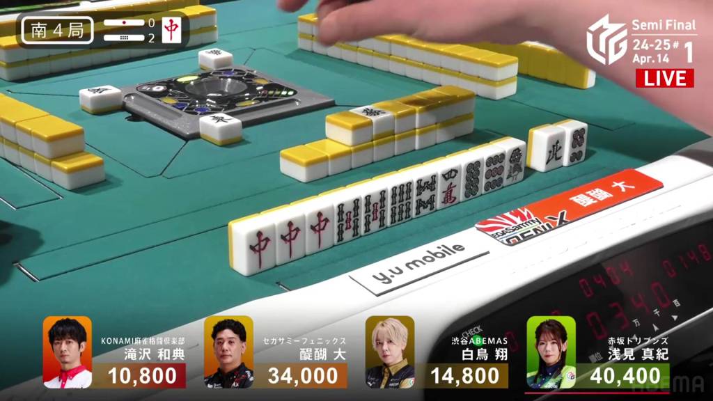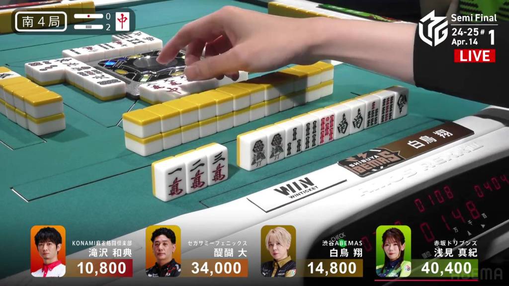In S4-2, Daigo is in 2nd place and 6,400 behind Asami. With two honba, Daigo needs a 2/40 direct hit (to tie), a 3/30 tsumo, or a 3/50 or 4/25 ron for 1st place.
