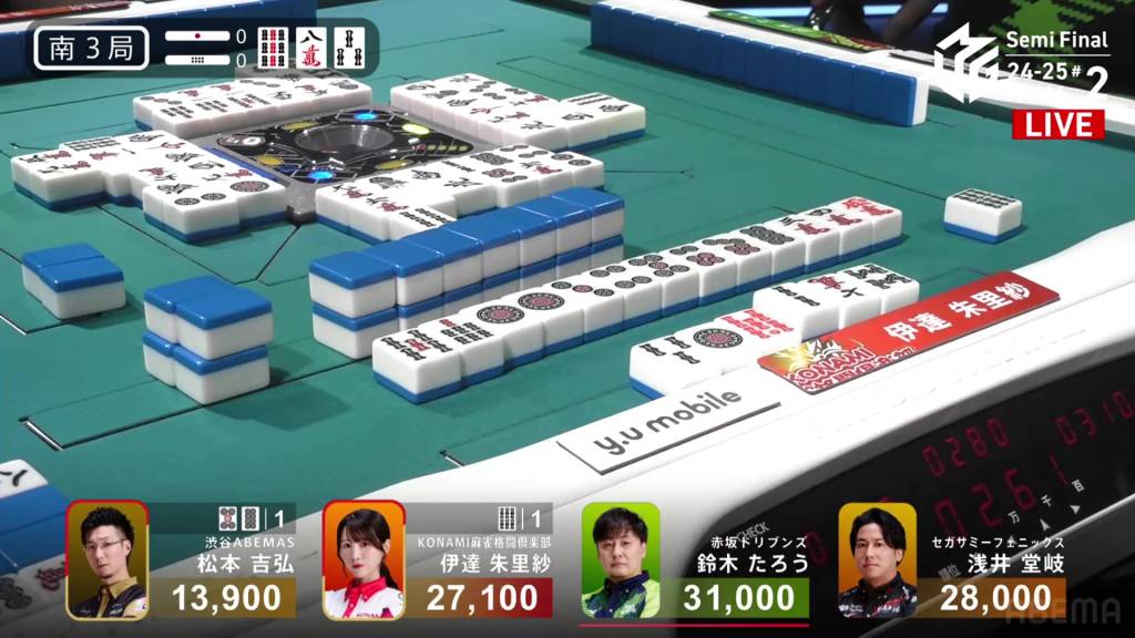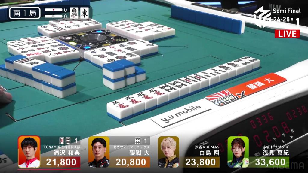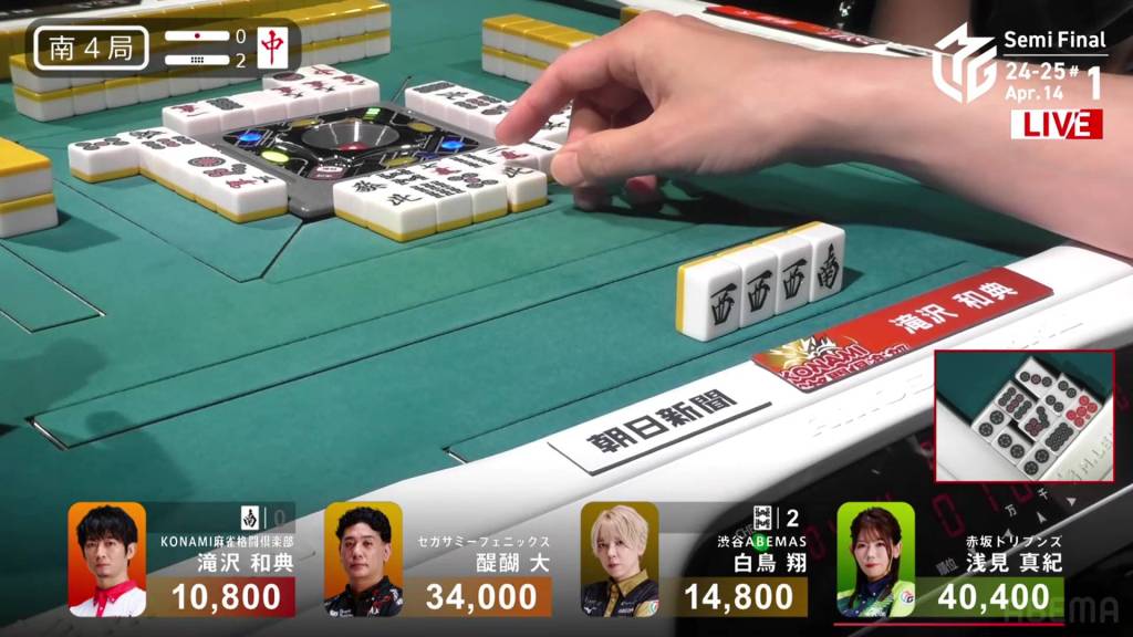 Soon after, Takizawa gets to tenpai on a south tanki, having enough value for 3rd place. Unfortunately, Shiratori holds the souths in a triplet.