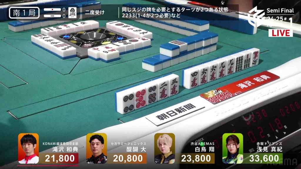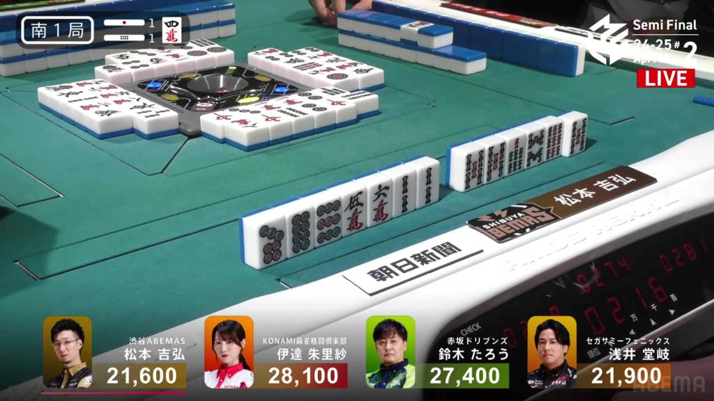 In S1-1, Takaki is in 3rd place, 5,500 behind 2nd place Taro and 6,200 behind 1st place Date. A riichi stick and a honba are in the pot. Takaki starts out the hand at 2-shanten with a pair of white dragons. The first row provides him with a third white dragon and shifts ihs focus to a potential pinzu honitsu, breaking his 68m shape. By the end of the first row, he is still two-away from it.