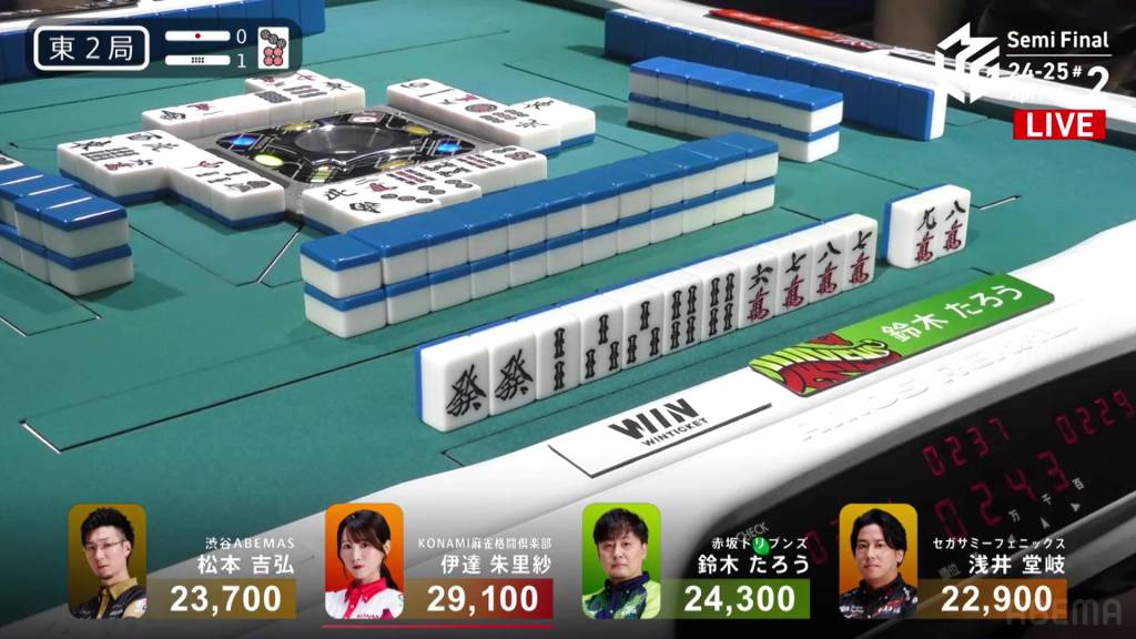 But, even as he folds, the wall tells him to push. On his next turn, the 3s becomes safe and he can shift the triplet back to a pair. Two turns later, he pairs up the 5s and gets to tenpai on a 4p tanki. On his very next draw, he gets the 4p and wins the hand. Daigo wins with Tsumo/Chiitoi/Dora 2 for 2,000/4,000 plus a riichi stick, moving up to 2nd place.