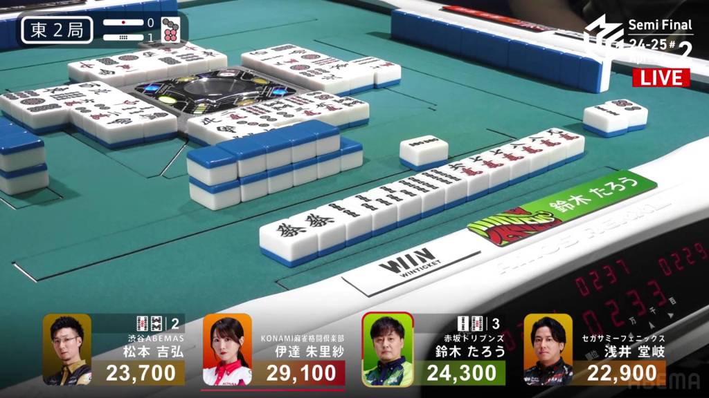 At the start of the third row, Takaki draws the 4m. Not wanting to discard the very live dora, Takaki holds onto it. In the middle of the row, he manages to pair it up and gets to tenpai on a 7p kanchan, staying dama. Immediately after, Matsumoto draws and discards the 7p, dealing into Takaki. Takaki wins the hand with White Dragon/Dora 2 for 6,400+300 plus two riichi sticks enough for 1st place.