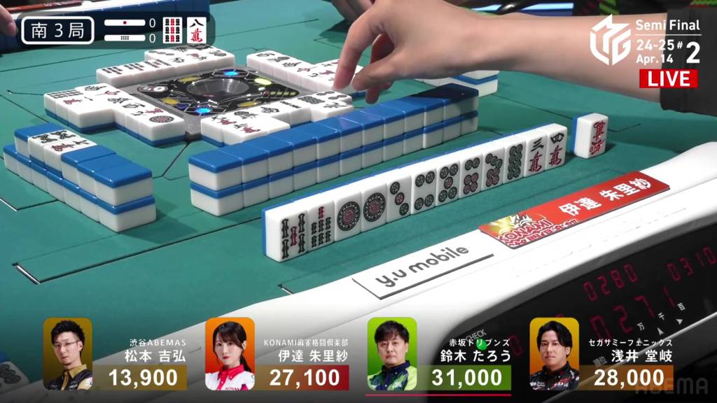 Back to Daigo, he is iishanten with a 69m ryanmen and a 7s kanchan. In the middle of the second row, Daigo draws the 6m and stays dama on the 7s kanchan. Within the go-around, Takizawa draws and discards the 7s and deals into Daigo. Daigo wins the hand with Red Dragon/Dora 3 for 8,000+600, finishing the game in top spot.