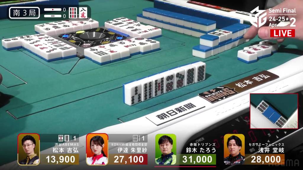 During the ippatsu round, Daigopairs up the south to get to tenpai and waits dama on an 8p tanki. On his next turn, he draws the dangerous 5s and chooses to switch.