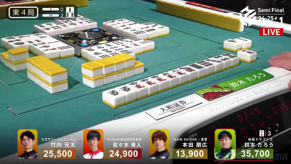 In E4-2, Taro is the dealer in 1st place with a 10,200 lead over winning the past three hands in a row.