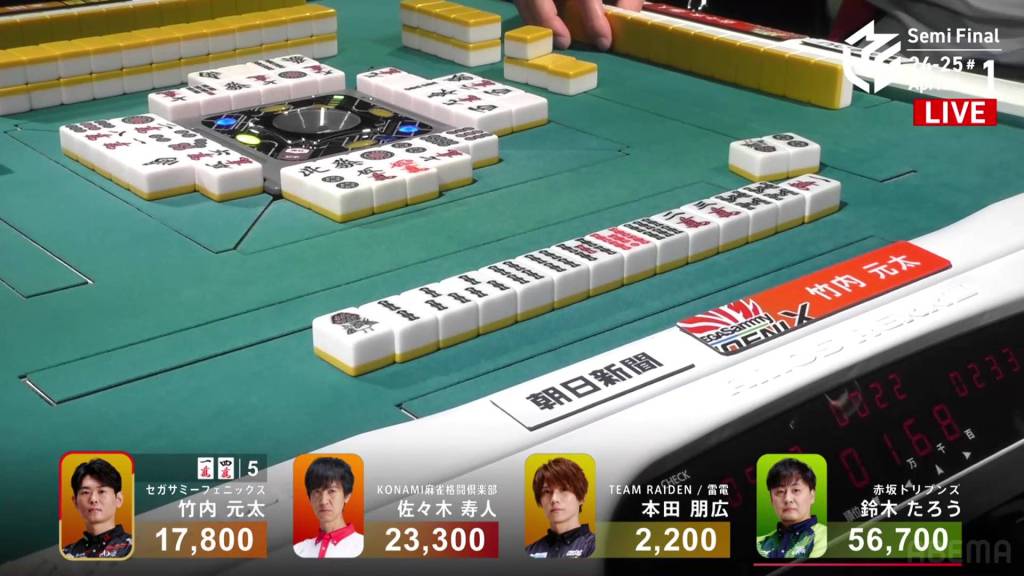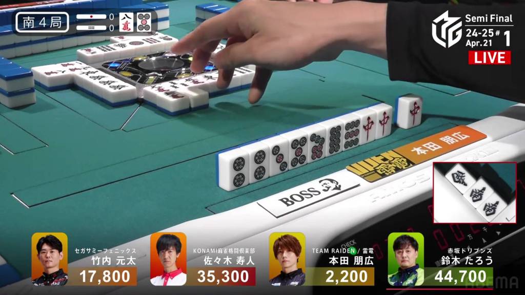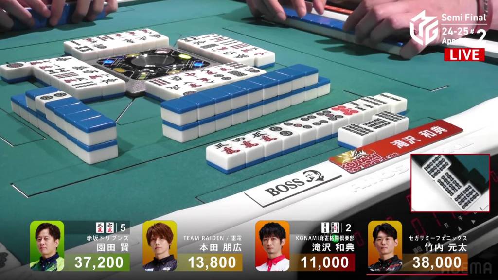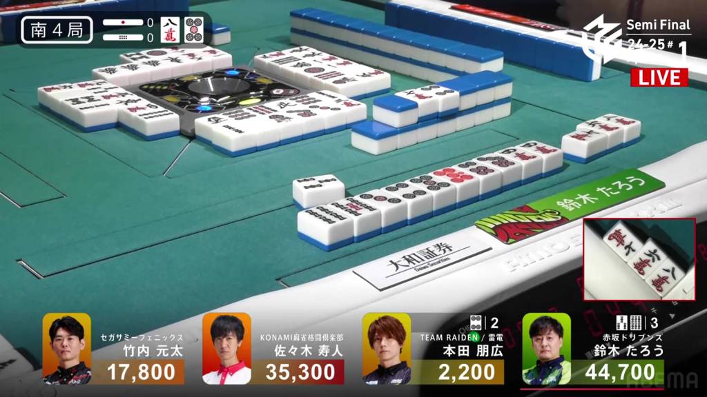 In S4-0, the scores are close. For the top spot, 1st and 2nd are separated by just 800. Any win by Sonoda would be enough for 1st place. Even a 3/30 tsumo by Honda or Takizawa can move dealer Genta down to 2nd place. At the bottom, Takizawa trails Honda by 2,800, needing a 3-han hand for 3rd place.