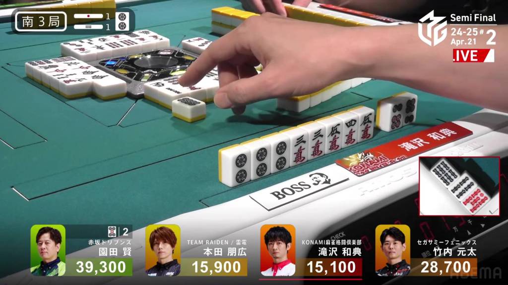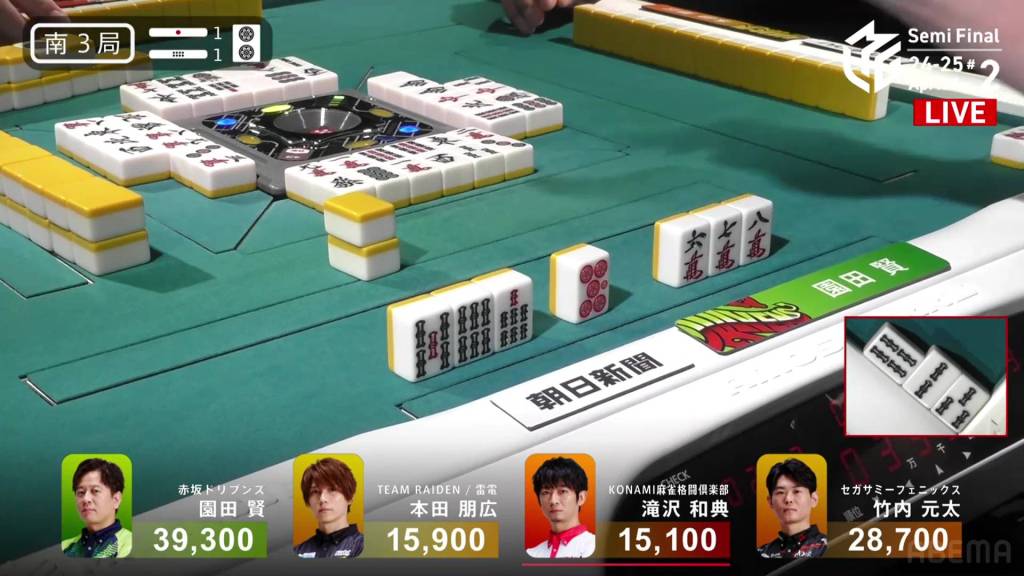 Back to Takizawa, he has a red 5p in his hand to go along with the 3p dora, enough value to open. At the start of the third row, he calls pon on the 6s and gets to tenpai on a 25s ryanmen. On his very next draw, he gets the 2s and wins the hand.