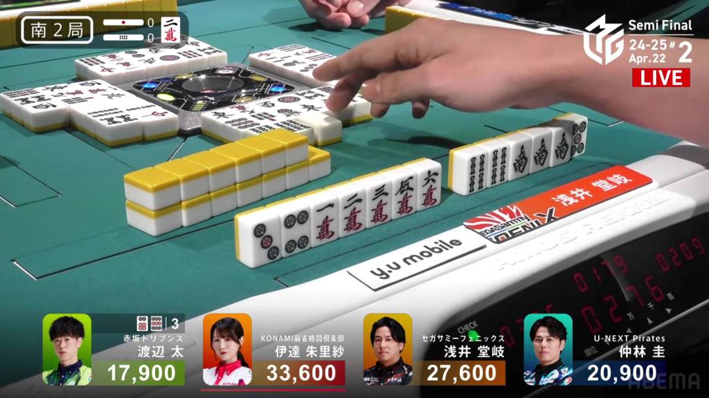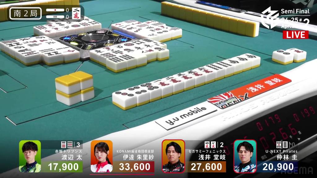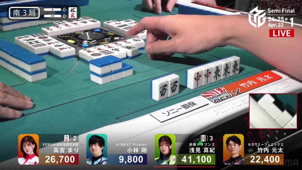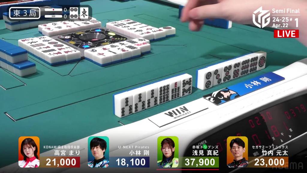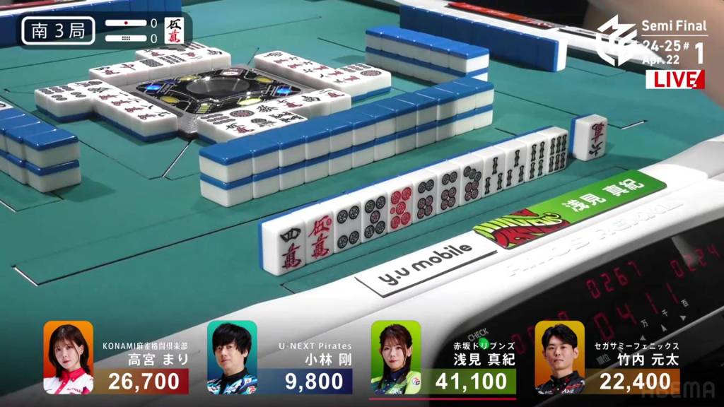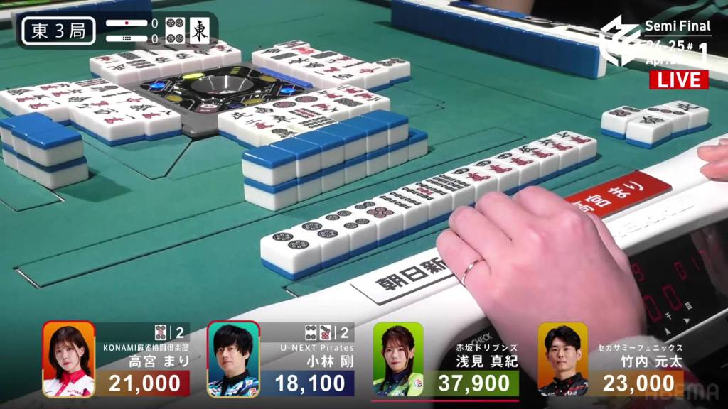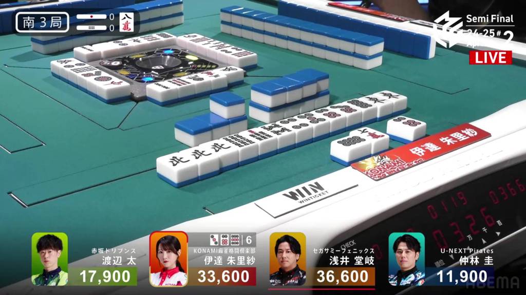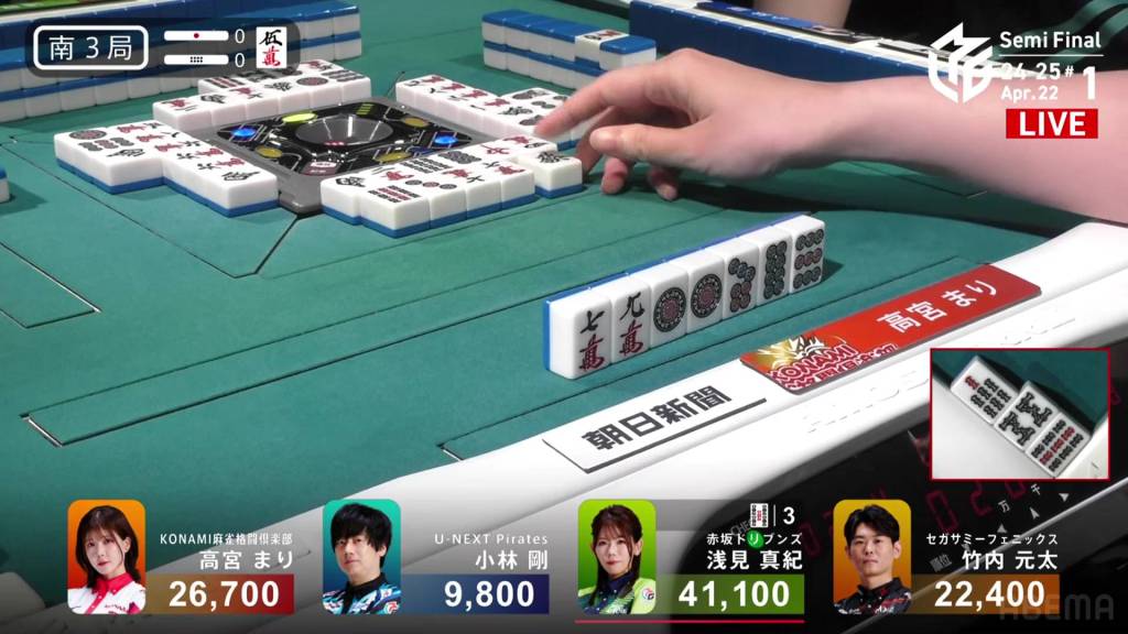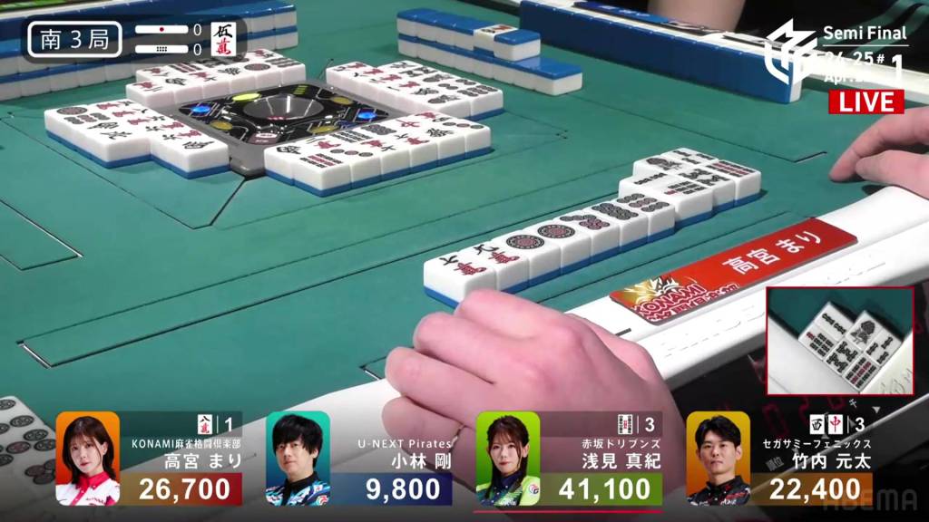 On Asami’s next turn, however, she draws the 8m. With no way to shift it, Asami discards it and deals into Takamiya. Takamiya wins the hand with Junchan/Sanshoku for 3,900. WIth the direct hit, Takamiya cuts Asami’s lead in half going into the final hand.