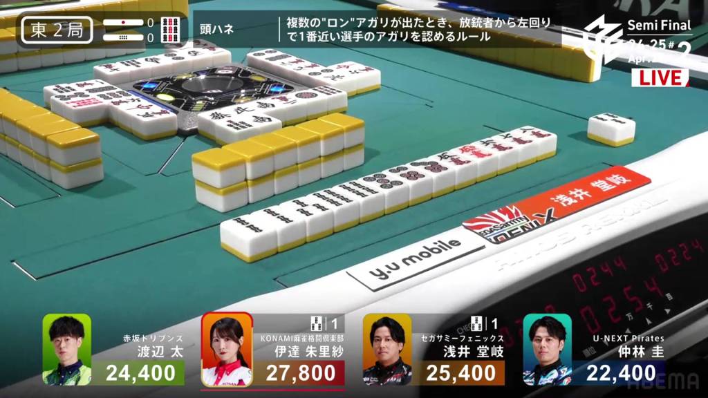 During the ippatsu round, Date gets to tenpai and waits on a 25p ryanmen, staying dama with mangan. Immediately after, Takaki discards the 2p, a tile safe against the dealer riichi, and deals into Date. Date wins the hand with Pinfu/Tanyao/Aka 2 for 8,000+300 plus rwo riichi sticks. With the direct hit off 1st place Takaki, Date becomes 1st place herself.