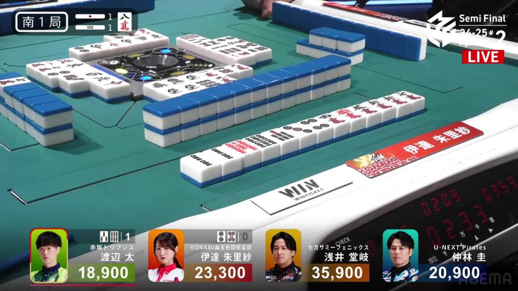 In S1-1, Date is in 2nd place and 12,600 behind 1st place Takaki. A riichi stick and a honba sit in the pot.