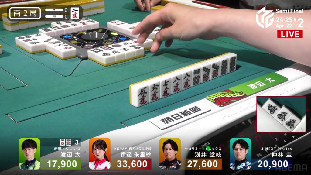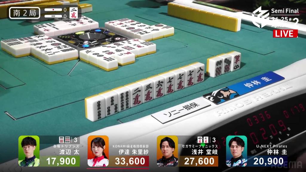 With both players waiting on the 3s, Date has the advantage in seat order and will win on ron. However, Takaki is able to draw the 3s in the middle of the second row and wins the hand. Takaki wins with Tsumo/Tanyao/Iipeikou/Aka 1 for 2,000/4,000 plus a riichi stick, moving into top spot.