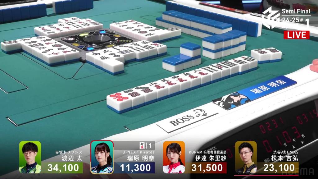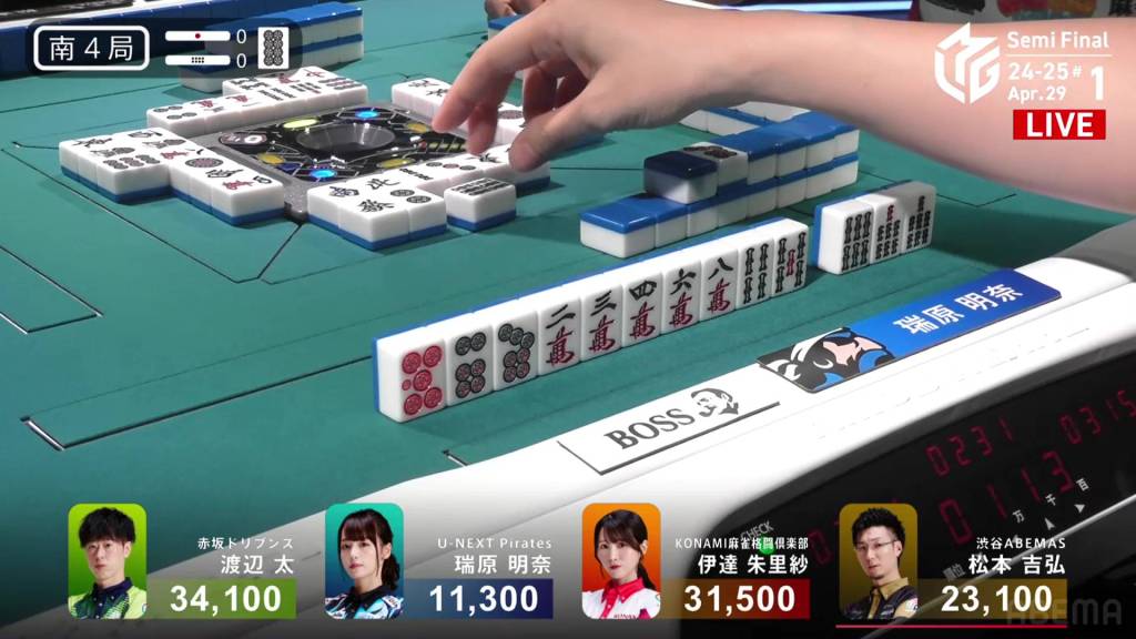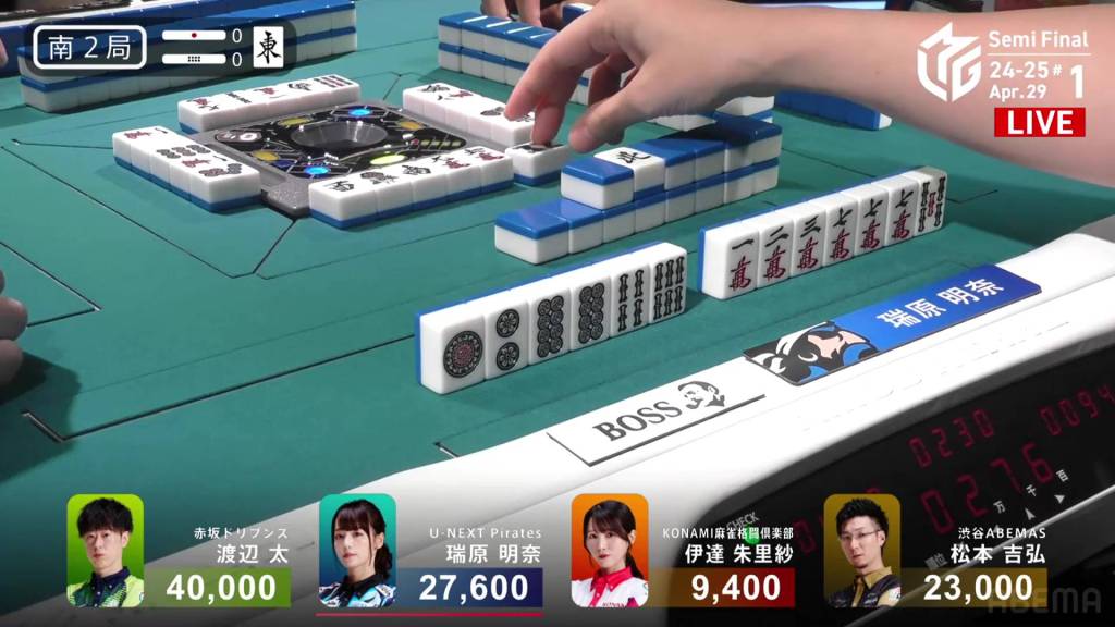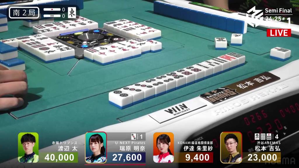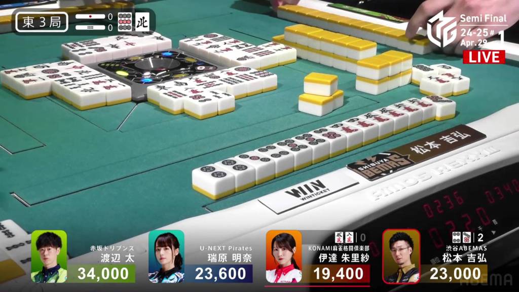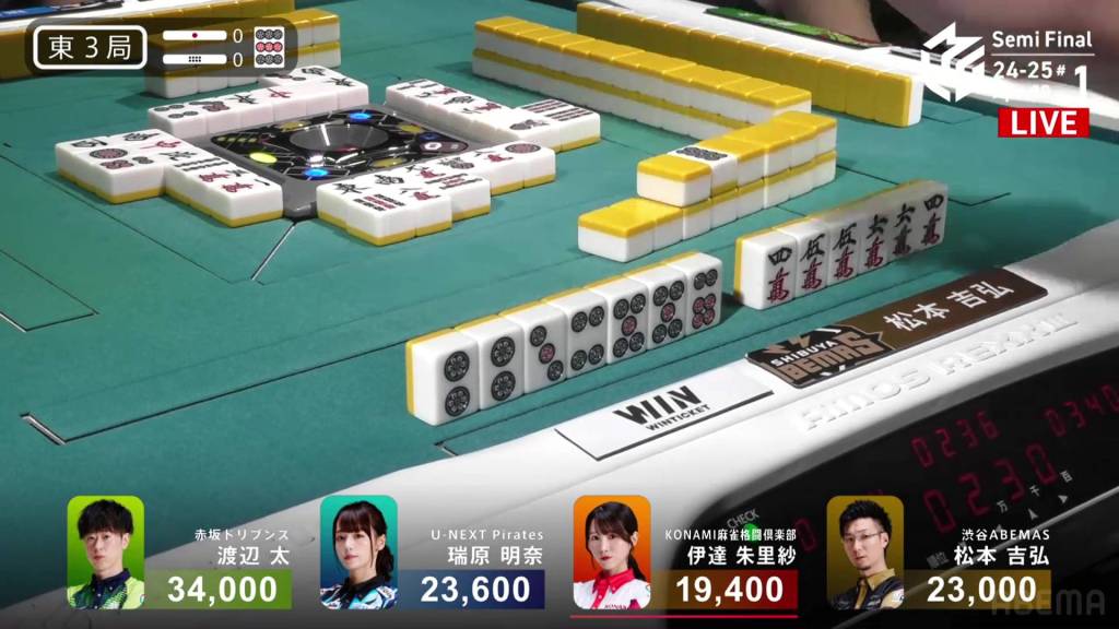 At the start of the third row, Mizuhara draws Date’s final 8m, leaving no winning tiles left for her. In the middle of the row, Matsumoto draws the 7p and wins the hand. Even though he doesn’t get any uradora, Matsumoto still wins the hand with Riichi/Tsumo/Pinfu/Tanyao/Iipeikou for 2,000/4,000, coming within 1,000 of 1st place.