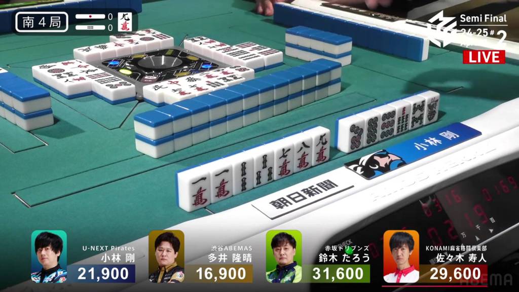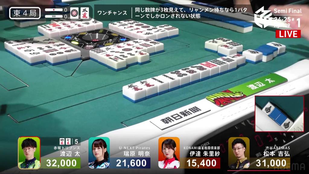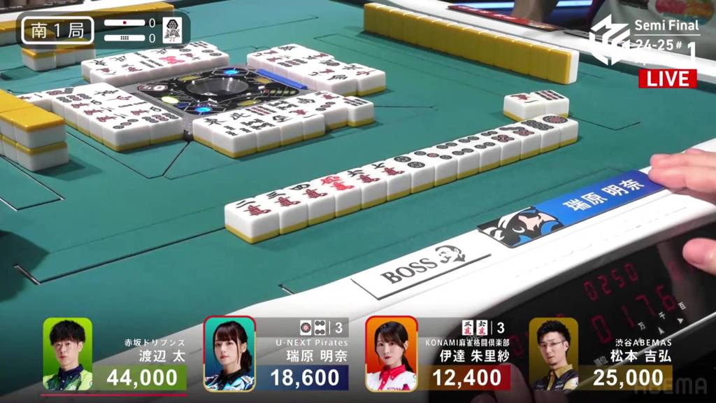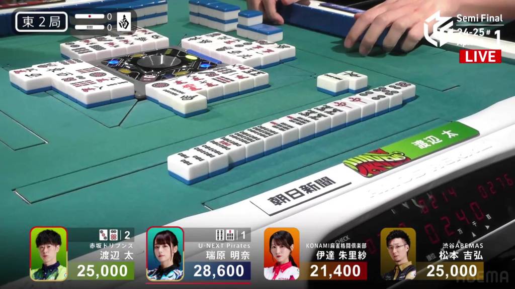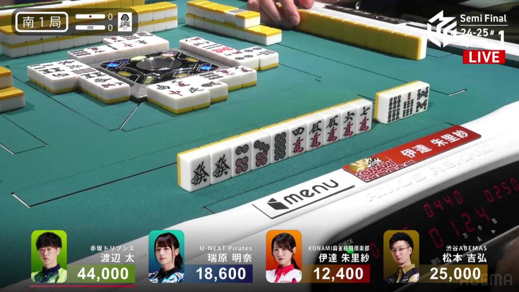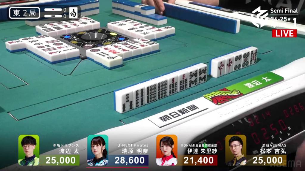 At the start of the third row, Mizuhara draws Date’s final 8m, leaving no winning tiles left for her. In the middle of the row, Matsumoto draws the 7p and wins the hand. Even though he doesn’t get any uradora, Matsumoto still wins the hand with Riichi/Tsumo/Pinfu/Tanyao/Iipeikou for 2,000/4,000, coming within 1,000 of 1st place.