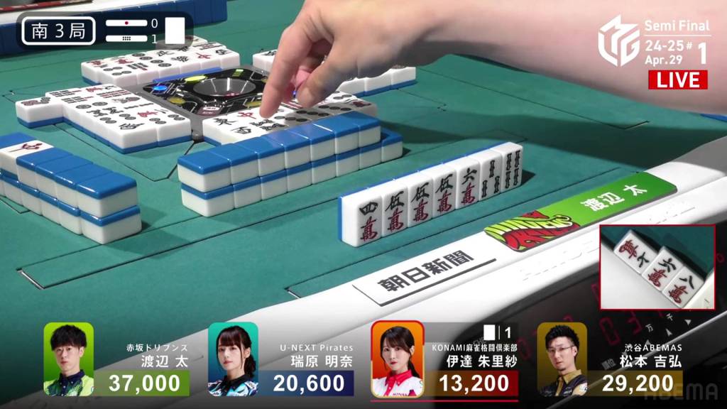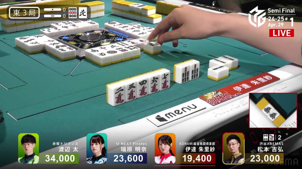 In the middle of the second row, Matsumoto calls riichi and waits on a 47p ryanmen, guaranteed at least a mangan.