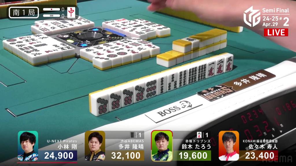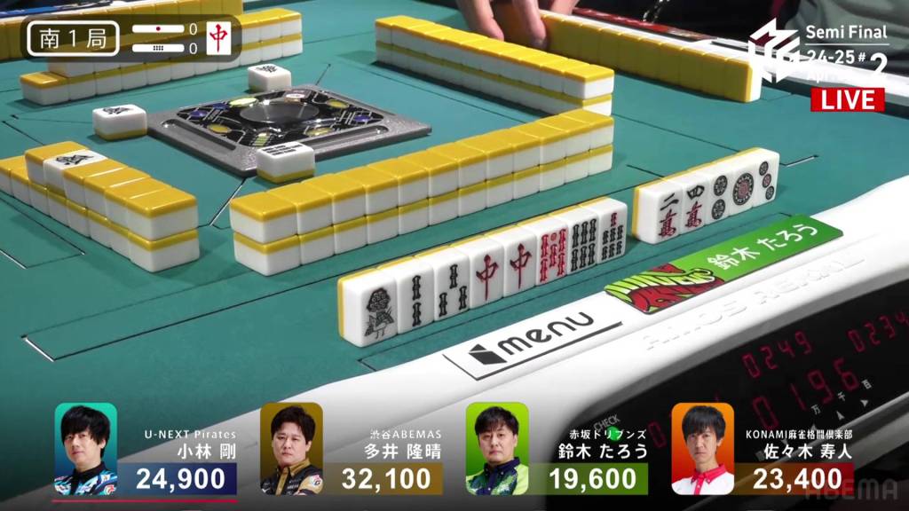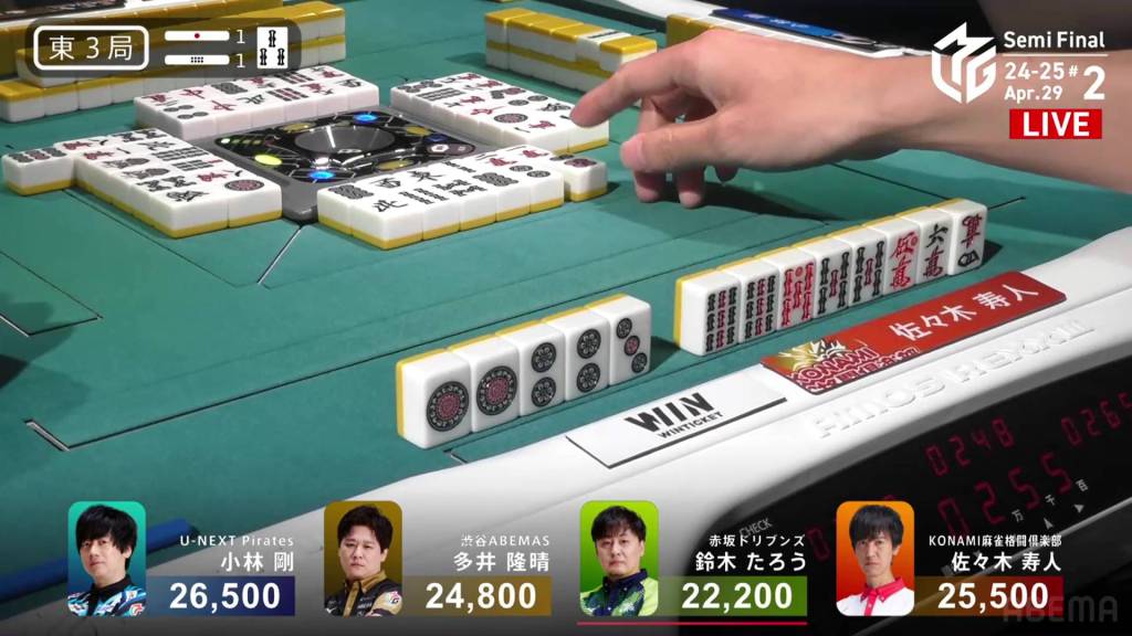 Across from her, 1st place Futoshi tries his best to fold, but good tiles keep on coming to him. Even as he has a chance to take tenpai and rejects it, tiles keep coming. In the third row, he finally accepts, calling a 6s pon and gets to tenpai on a 25s ryanmen.
