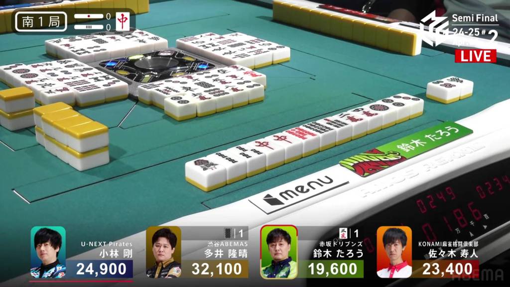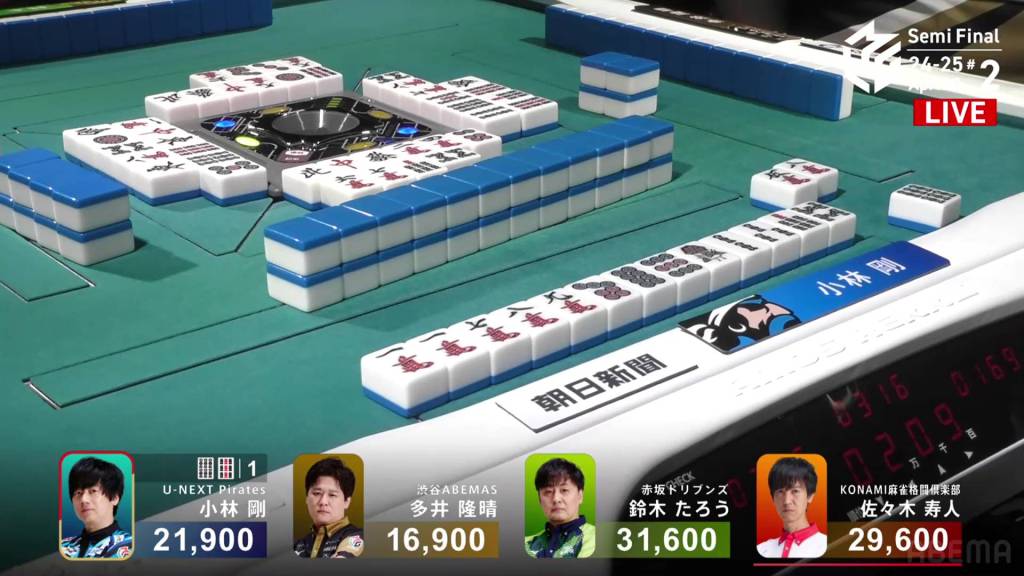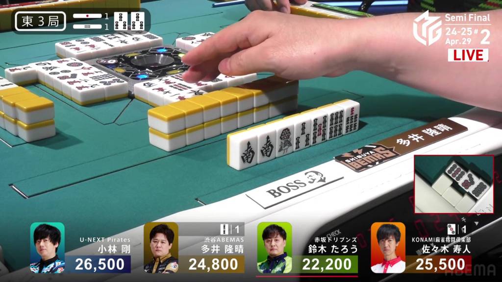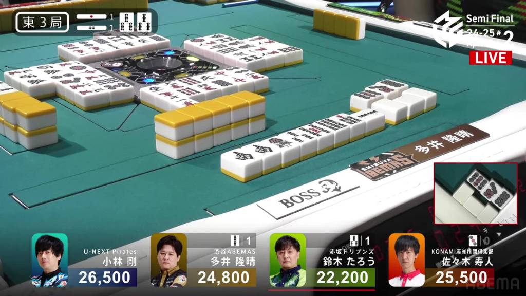 In E3-1, Ooi is in 3rd place and just 1,700 behind 1st place Kobayashi. With a riichi stick and a honba in the pot, any win is enough to move into 1st place.