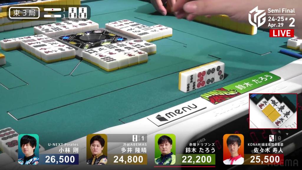 Between the two of them is Taro. When he draws a fourth 3m, he calls a concealed kan and and makes the 3s the double dora. With a pon on the east, he gets to iishanten. With a 4m pon, he gets to tenpai on a 3s double dora tanki, guaranteed a haneman if he wins.