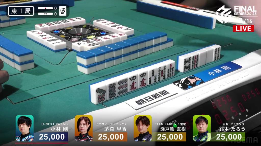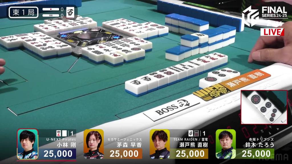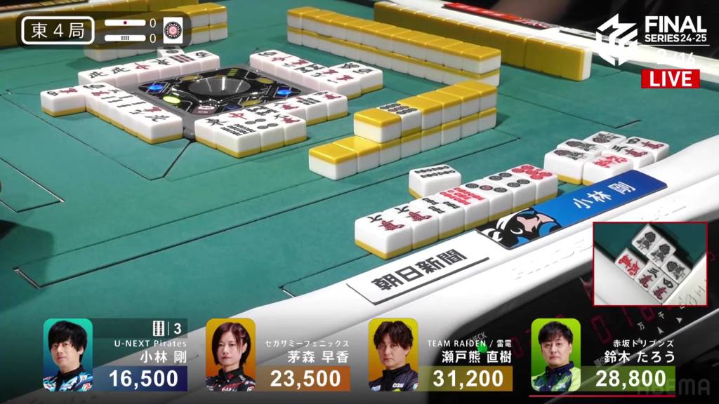 In E4-0, Kobayashi is in 4th place and 7,000 behind 3rd place Kayamori after dealing into a mangan while in riichi in the first hand of the game.