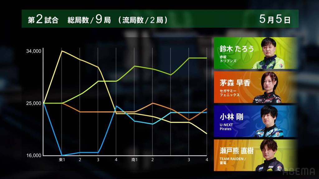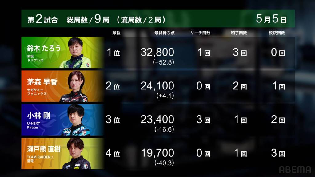With Taro’s win, the Akasaka Drivens regain the lead over the Sega Sammy Phoenix. A 3rd place by the Pirates drops them a bit further in 3rd place, but are still within striking range of the top. Setokuma’s 4th place drops Team Raiden back into the negatives. 14 games remain.