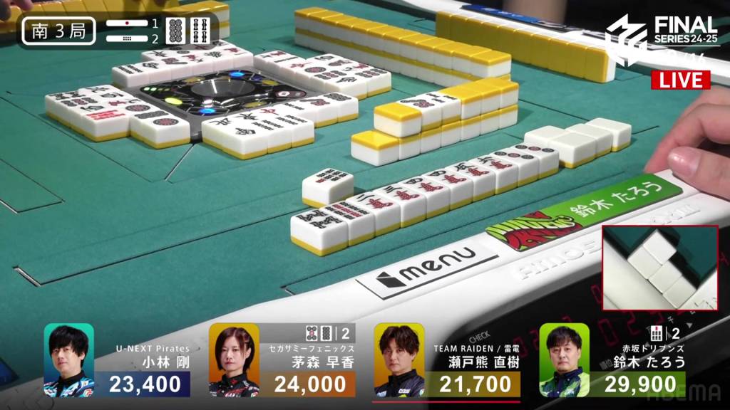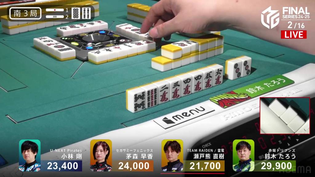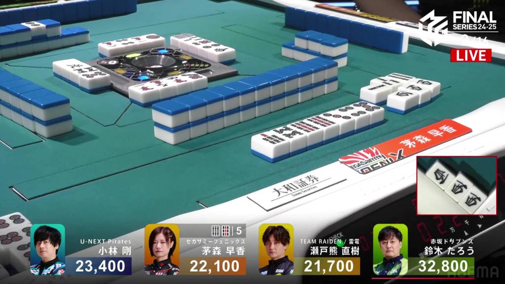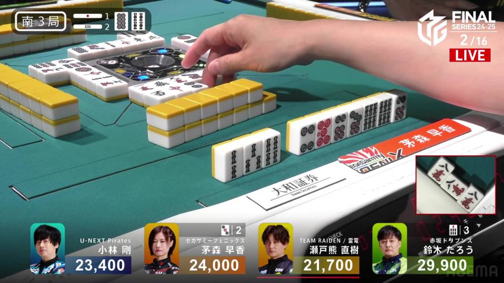 In S3-2, Taro in 1st place, but only 8,200 ahead of 4th place dealer Setokuma. With a riichi stick and two honba in the pot, a 3/40 win by anyone would kick him out of top spot.