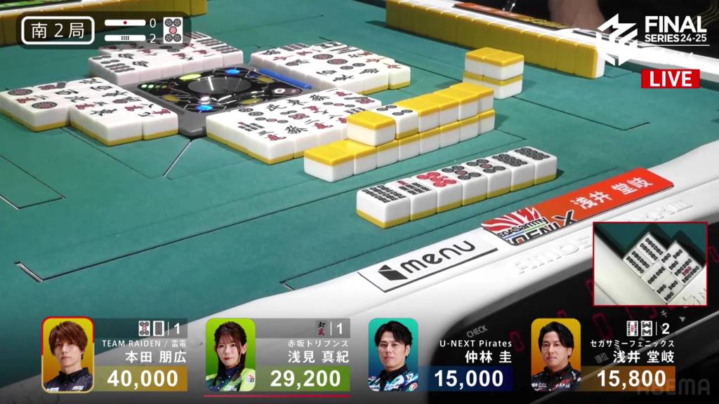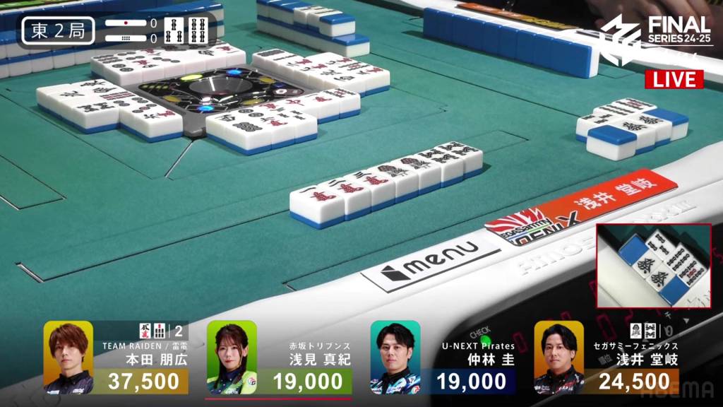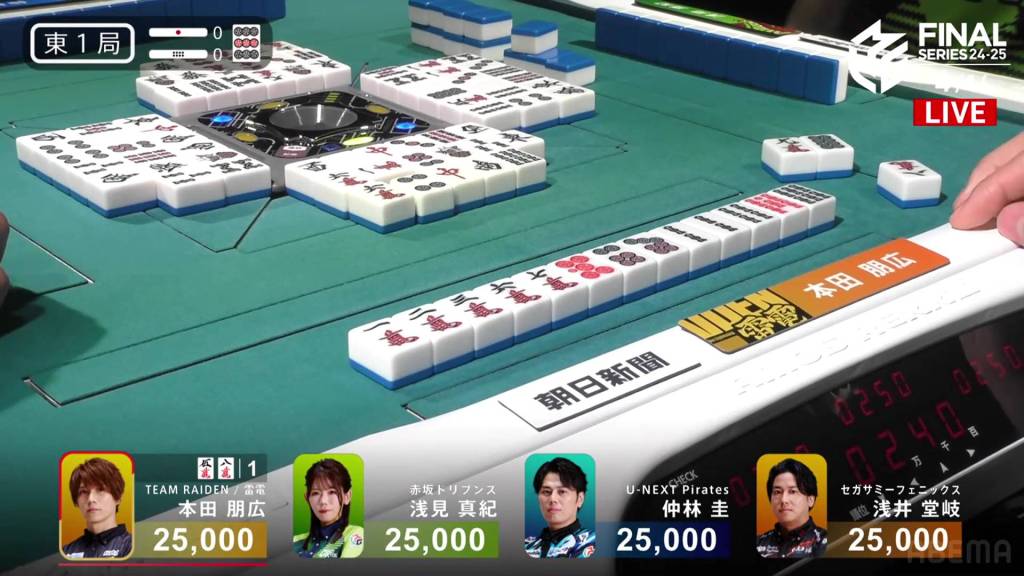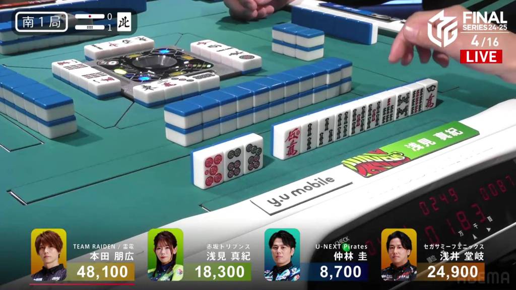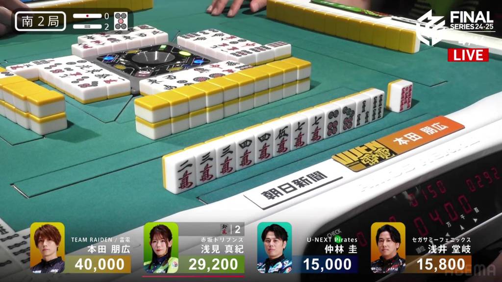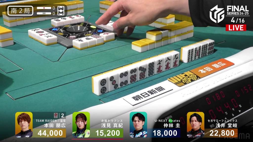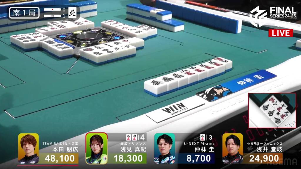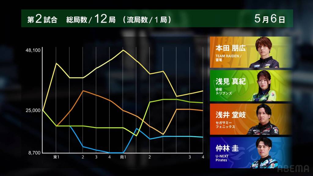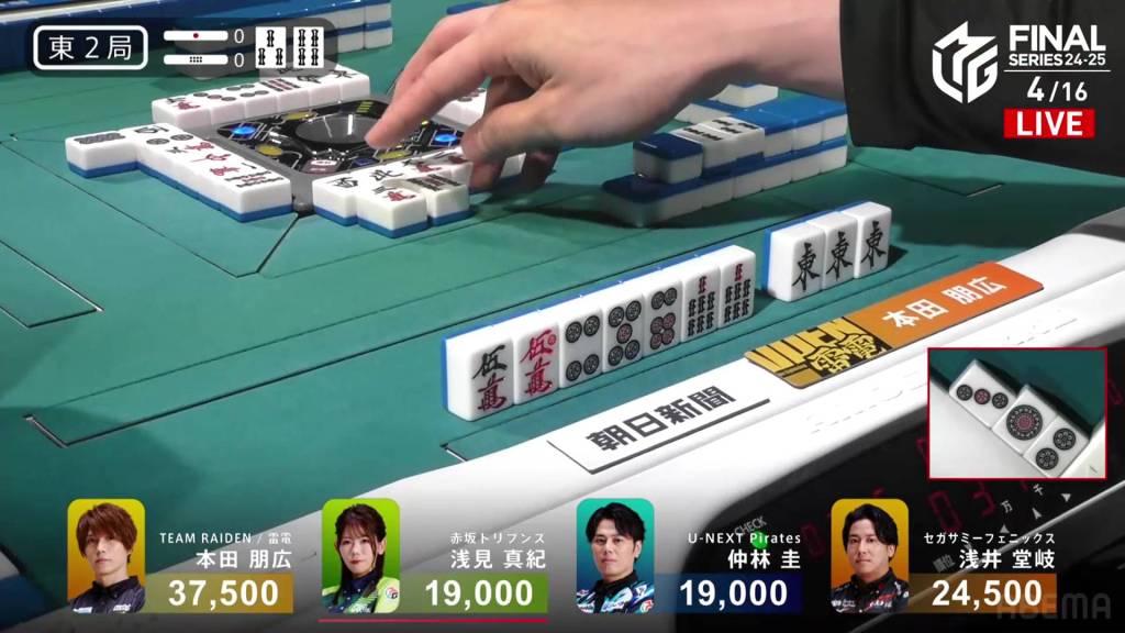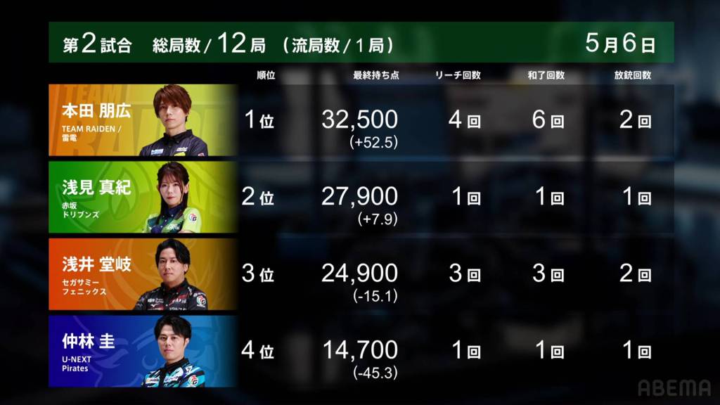 With Honda winning half of the hands in the game, Honda gets Team Raiden’s first win of these finals. The Akasaka Drivens return to the top of the standings after placing just above the Sega Sammy Phoenix, but the lead is just 14.9pts. Nakabayashi’s 4th place pushes the team even further from the top 2, now 160.8pts from 2nd place.
