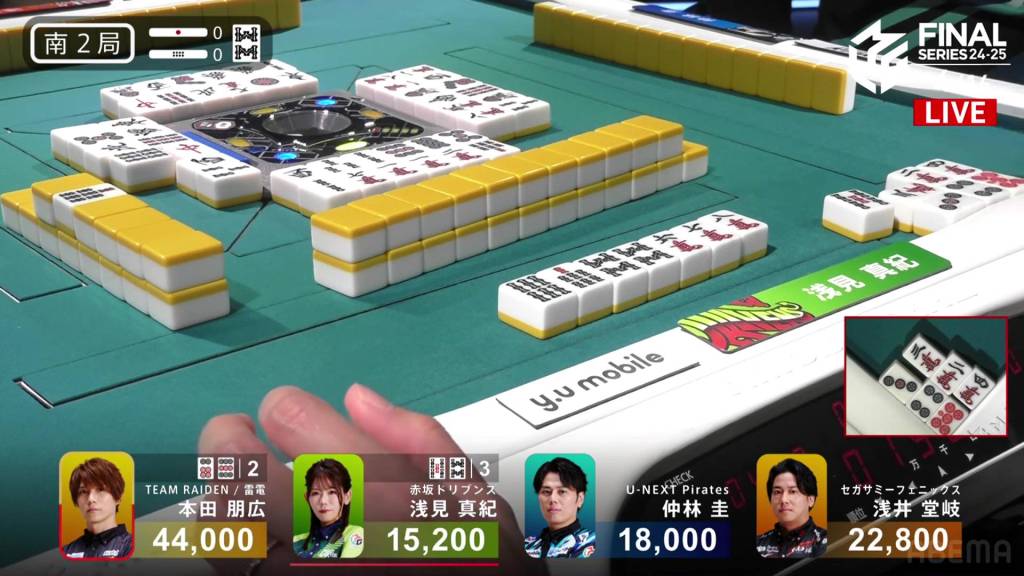 In S2-0, Asami is the dealer in 4th place after being passed the previous hand. She is 2,800 behind 3rd place Nakabayashi and 7,600 behind 2nd place Takaki.