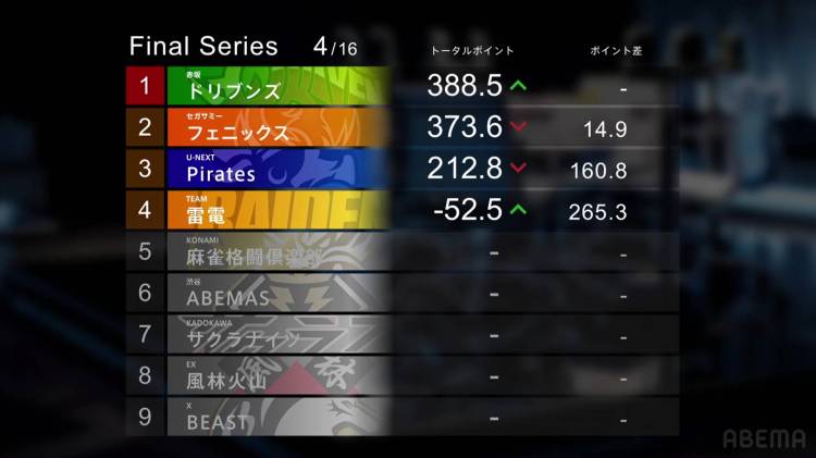 The Akasaka Drivens are in the lead, but just 14.9pts ahead of Sega Sammy Phoenix. The Sega Sammy Phoenix placing above the Akasaka Drivens in the next game will flip these standings. The U-Next Pirates have some work to do to move above, while Team Raiden has a lot of work to do in their next 12 games.