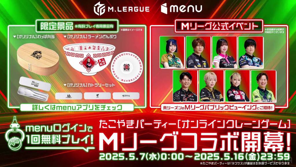 As a promotion, menu delivery has an online crane game with M-League themed prizes, including merchandise and a special invitation to a public viewing next season.
