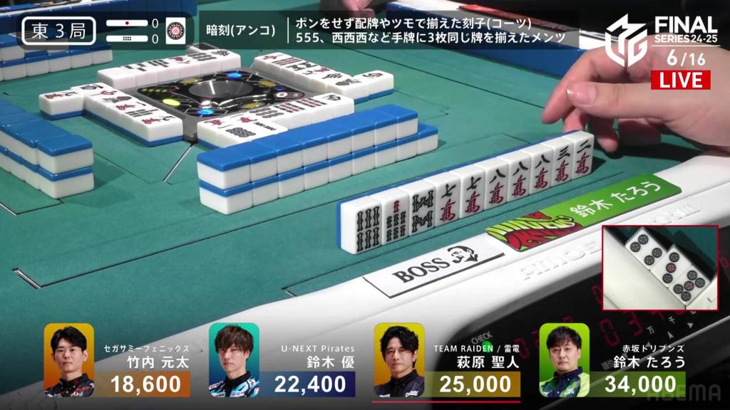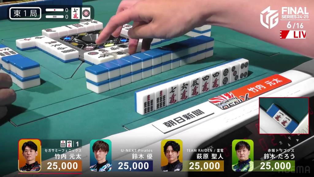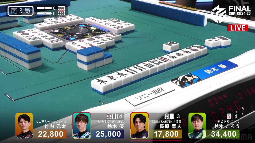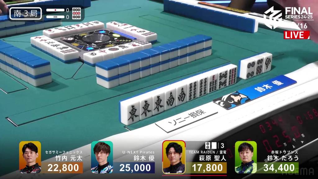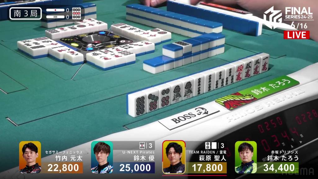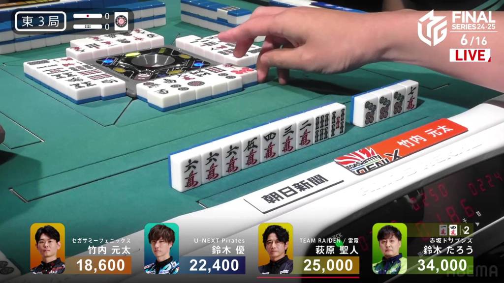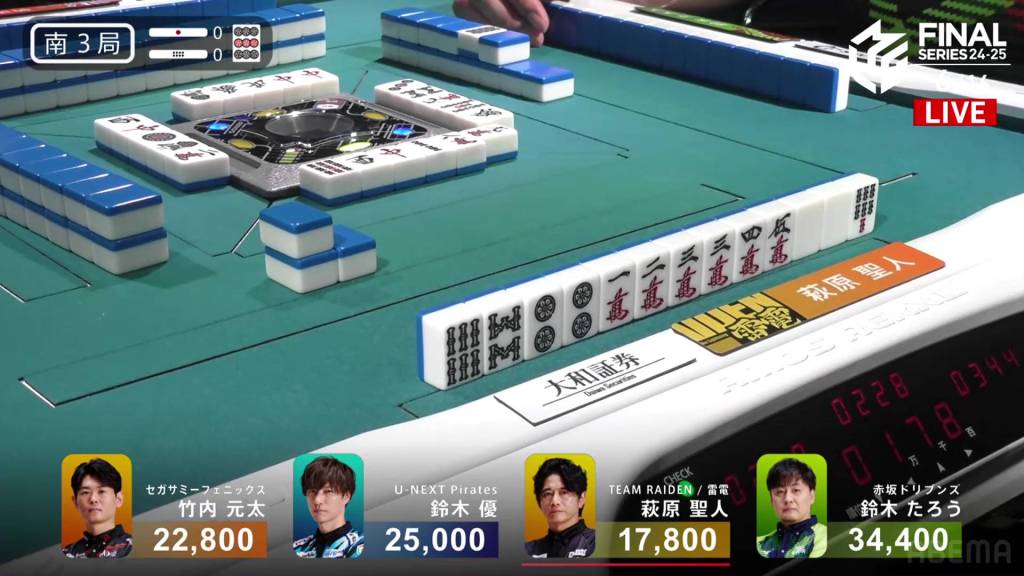 Looking around the table, Taro and Yu are iishanten, while Hagiwara is 2-shanten. The first to tenpai is Taro, who waits on a 14m ryanmen, but is only allowed to win on the 4m.