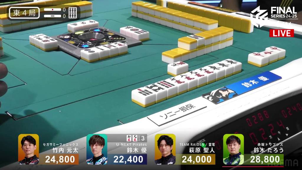 In E4-0, Yu is in 4th place, 2,400 behind 2nd place Genta and 6,400 behind 1st place dealer Taro.