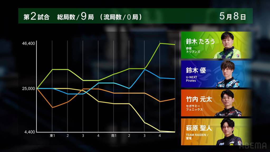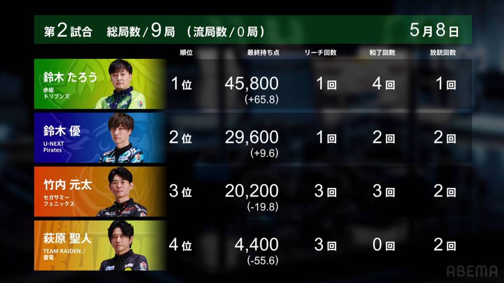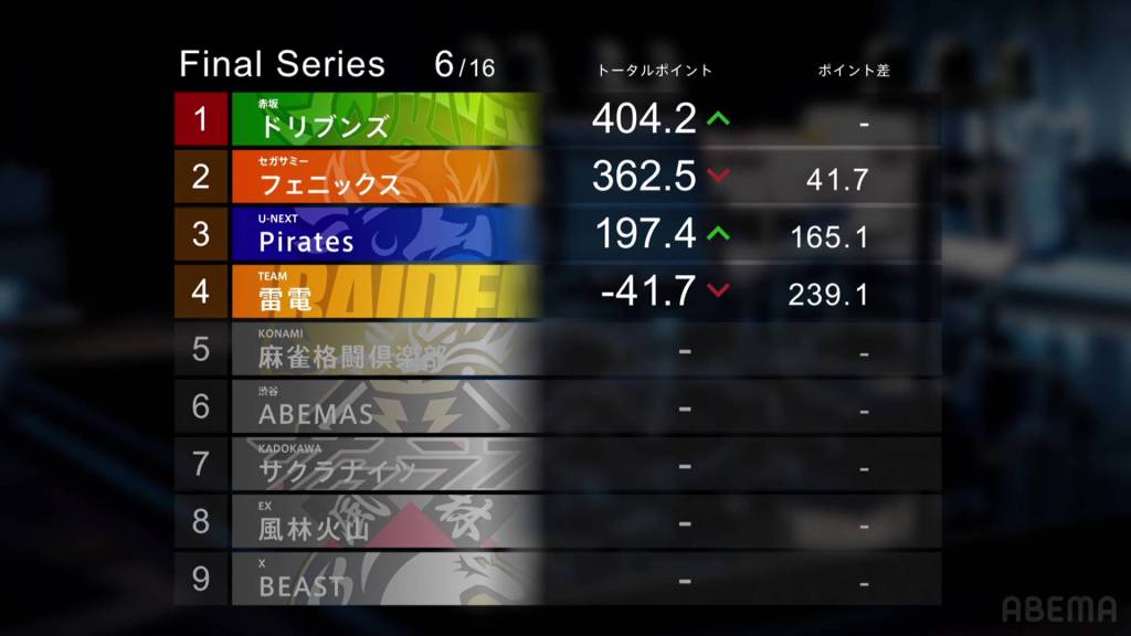 With the 1st/3rd between the Akasaka Drivens and Sega Sammy Phoenix, the Akasaka Drivens have the lead again. Though the U-Next Pirates finally get their first gain of the semifinals, they actually drop a bit further away from the top 2. Hagiwara’s 4th place ends up dropping Team Raiden into the negatives again.