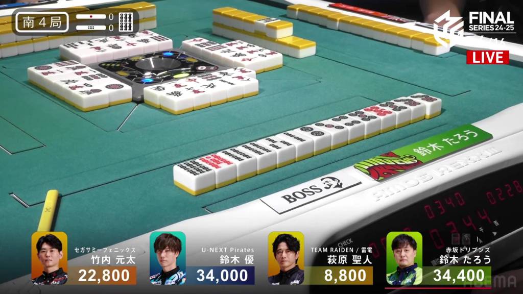 In S4-0, Taro is the final dealer with a 400 lead. With even a tsumo penalty moving him down to 2nd, Taro wants to win to remove any doubt.