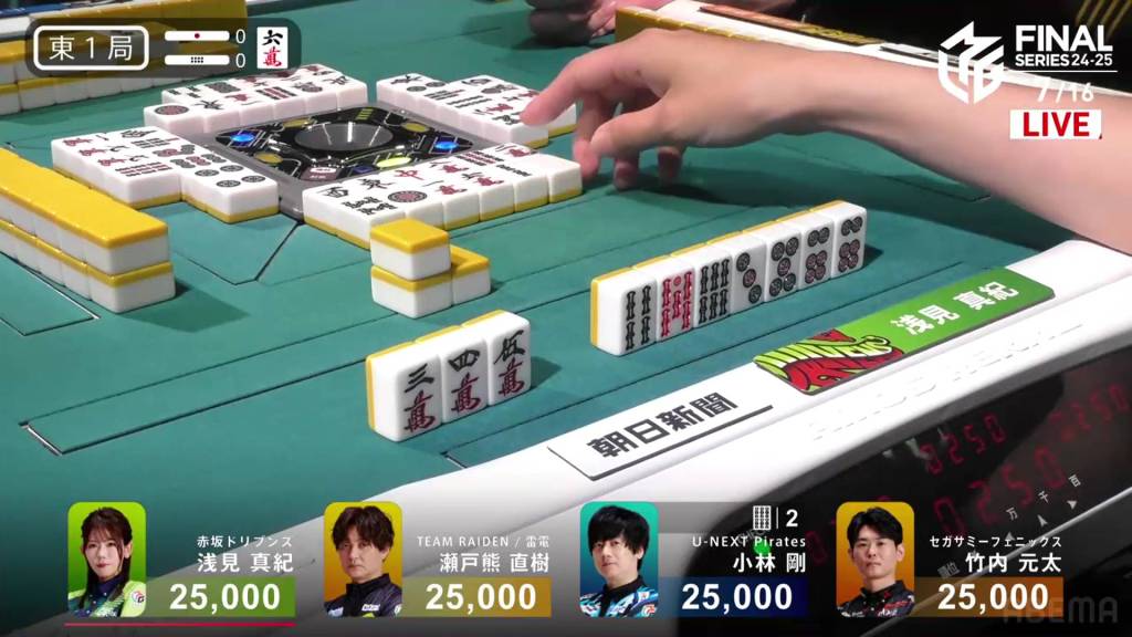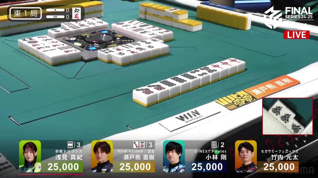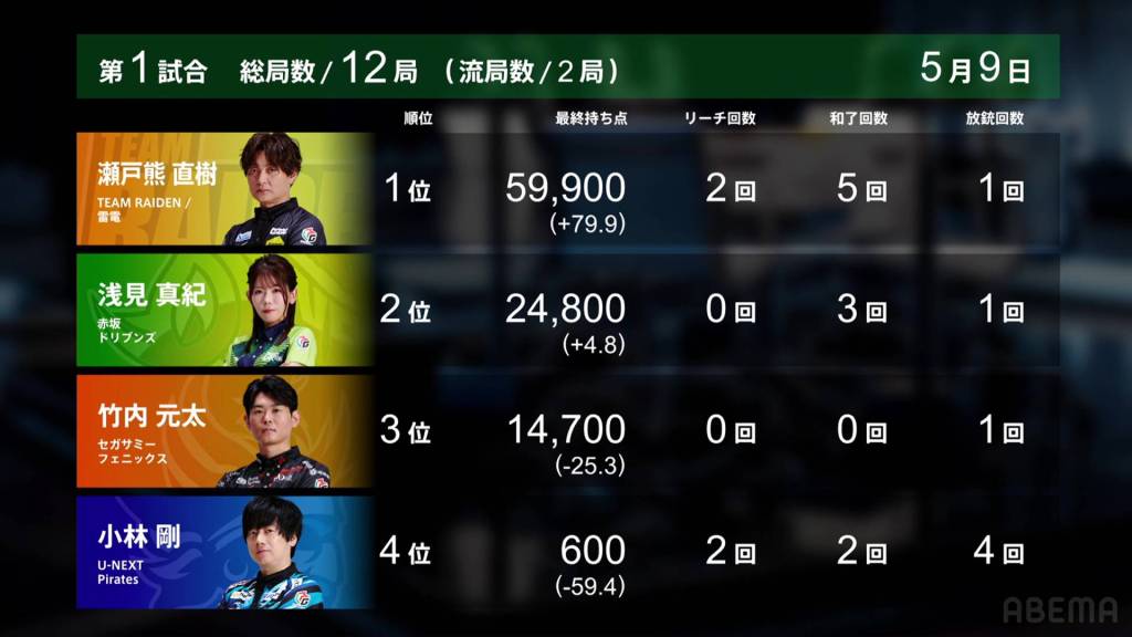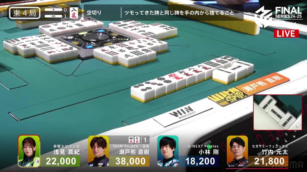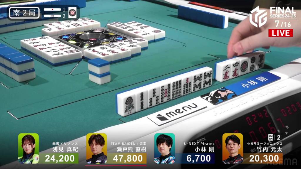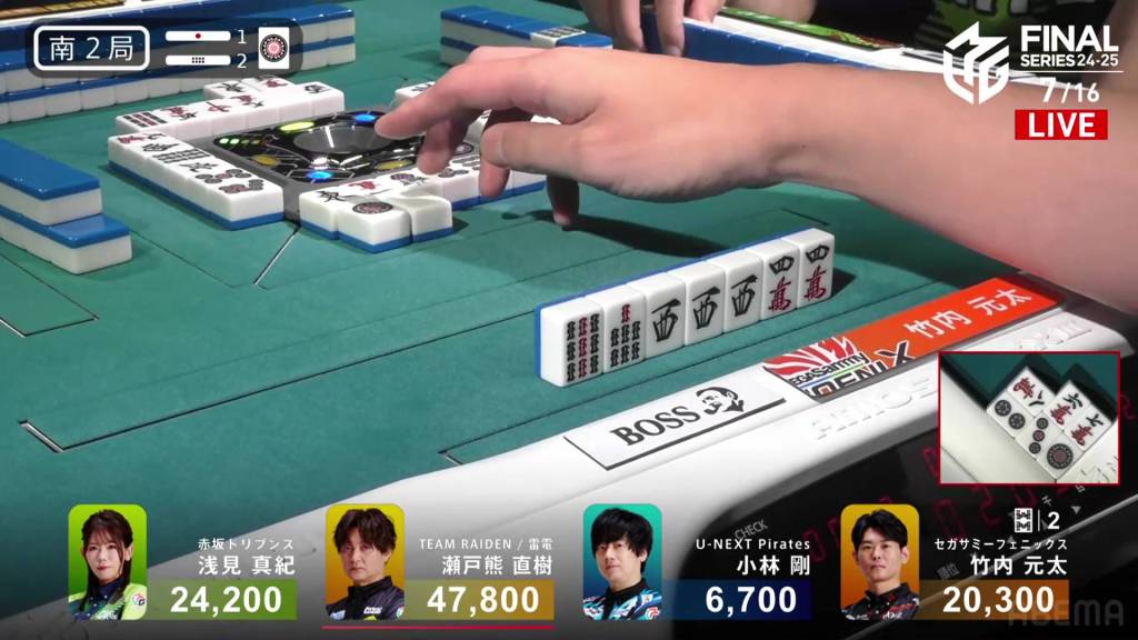 On Setokuma’s turn, he draws a third red dragon and gets to tenpai on a 36p ryanmen, guaranteed at least a mangan. Immediately after, Kobayashi draws and discards the 3p and wins the hand. Setokuma wins with Honitsu/Green Dragon/Red Dragon for 8,000.